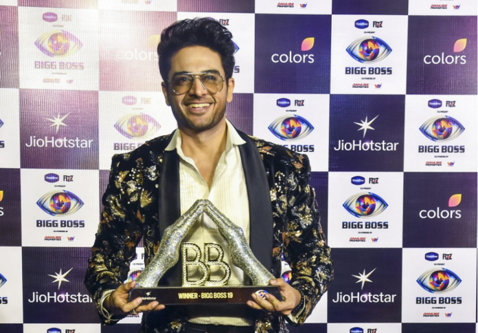 Mumbai: Bigg Boss Season 19 winner Gaurav Khanna poses with the trophy after the reality show's grand finale, in Mumbai, Sunday, Dec. 7, 2025. (PTI Photo)(PTI12_08_2025_000258B) *** Local Caption ***