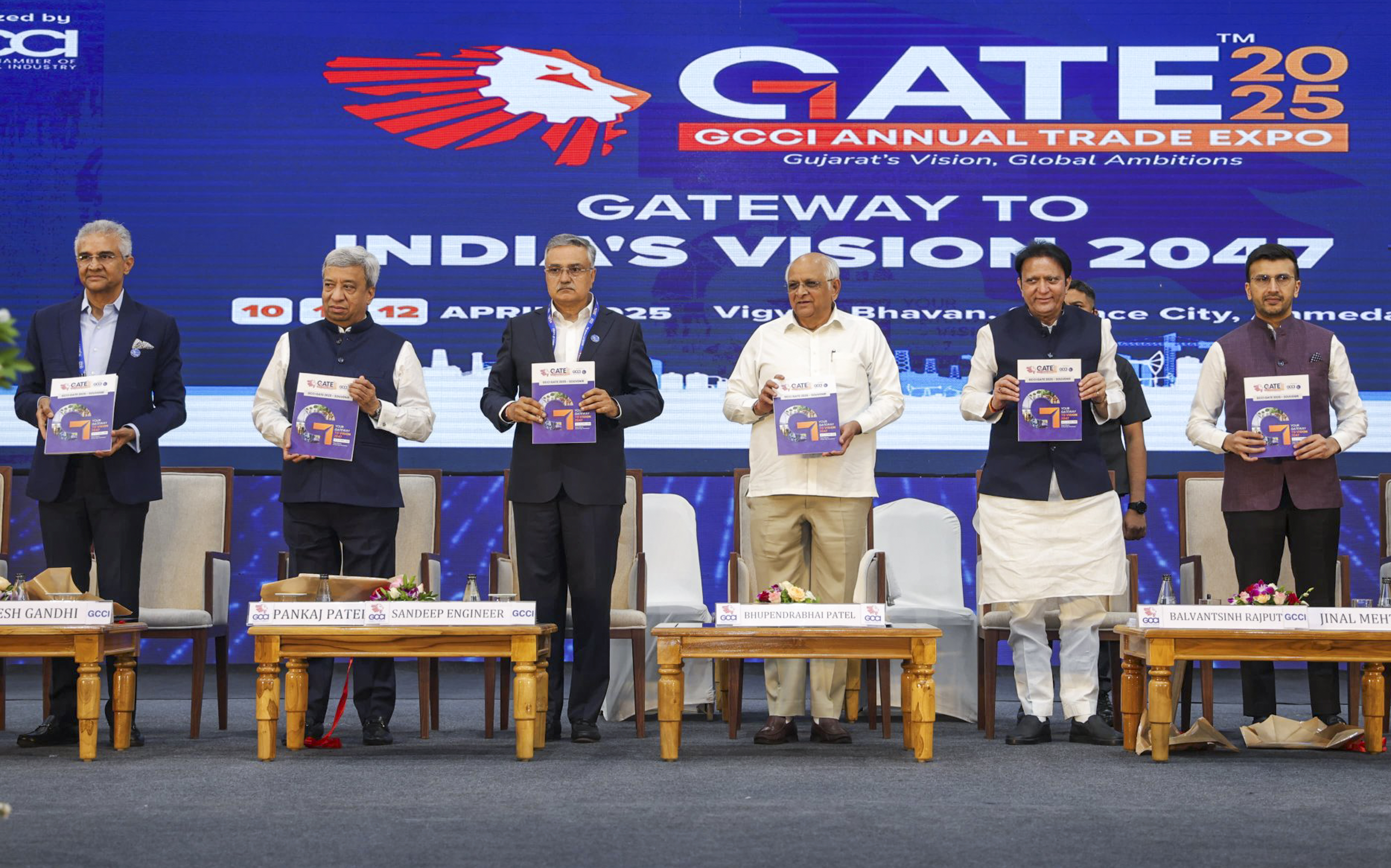 **EDS: THIRD PARTY IMAGE** In this image released by @CMOGuj via X on April 10, 2025, Gujarat Chief Minister Bhupendra Patel with members of the Gujarat Chamber of commerce and Industries (GCCI) during the inauguration of first day of three days long GCCI Annual Trade expo 2025. (@CMOGuj on X via PTI Photo) (PTI04_10_2025_000163B)