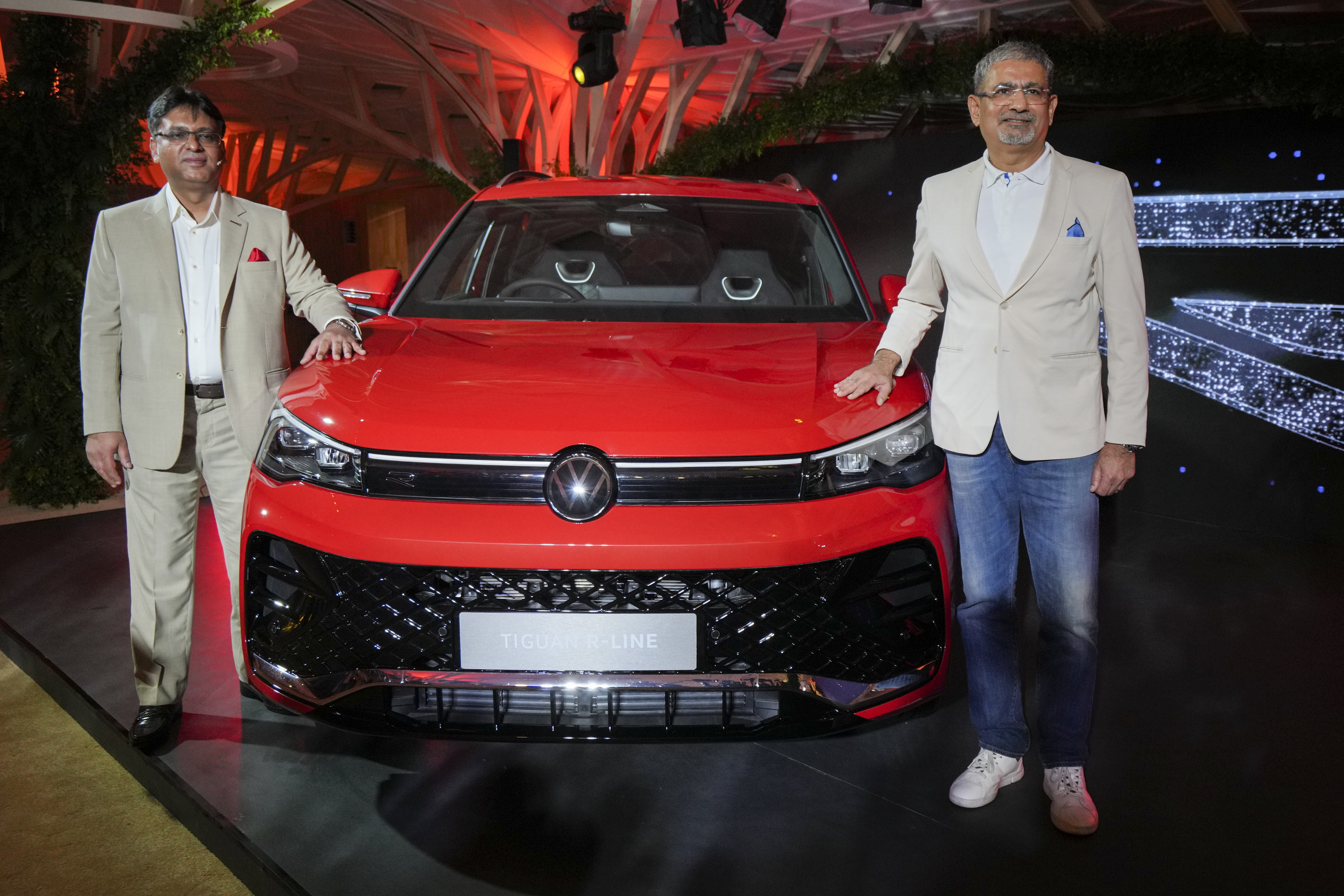 Mumbai: Ashish Gupta, Brand Director, Volkswagen India and Skoda Auto Volkswagen India CEO Piyush Arora during the launch of Volkswagen's Tiguan R-Line SUV, in Mumbai, Monday, April 14, 2025. (PTI Photo/Shashank Parade)(PTI04_14_2025_000170B)