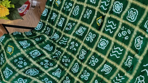 Craftspeople produce Gharchola through a combination of hand-weaving, tie-dye (bandhani) and zari work. Weft and warp silks form the base grid; artisans tie small portions to resist dye where needed, then add zari (metallic thread) to outline or fill motifs. The result is a textile that merges the precision of loom weaving with the slow, labor-intensive work of tie-dye and hand-embroidery – techniques passed down through family workshops and cooperative looms. Raw materials commonly cited include gajji silk and real or art-zari, while colouring traditionally favours festive red and maroon shades associated with bridal wear.
