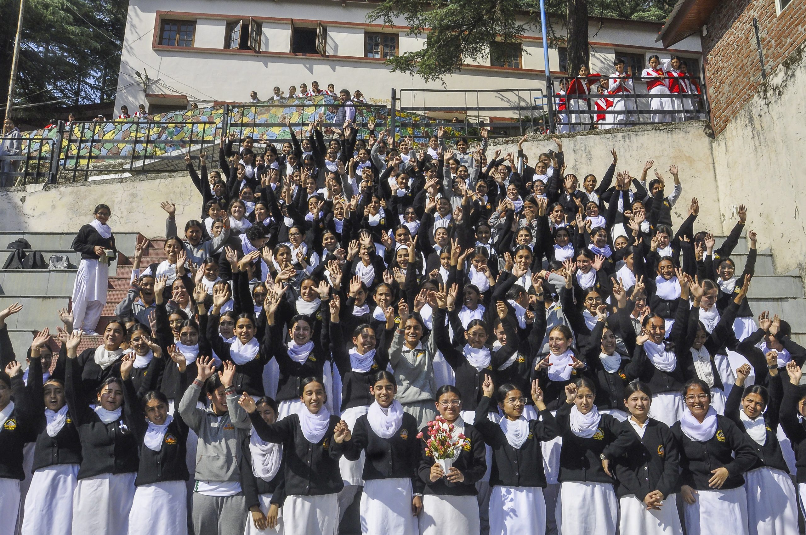Shimla: Students react after declaration of the 10th class results by Himachal Pradesh Board of School Eduction, in Shimla, Thursday, May 15 2025. (PTI Photo) (PTI05_15_2025_000293B)