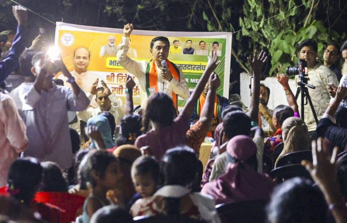 **EDS: THIRD PARTY IMAGE; SPECIAL PACKAGE** In this image received on April 2, 2026, Goa Chief Minister Pramod Sawant during campaigning for the Ponda Assembly By-Election in support of BJP candidate Ritesh Ravi Naik. (Handout via PTI Photo)(PTI04_02_2026_000233B)