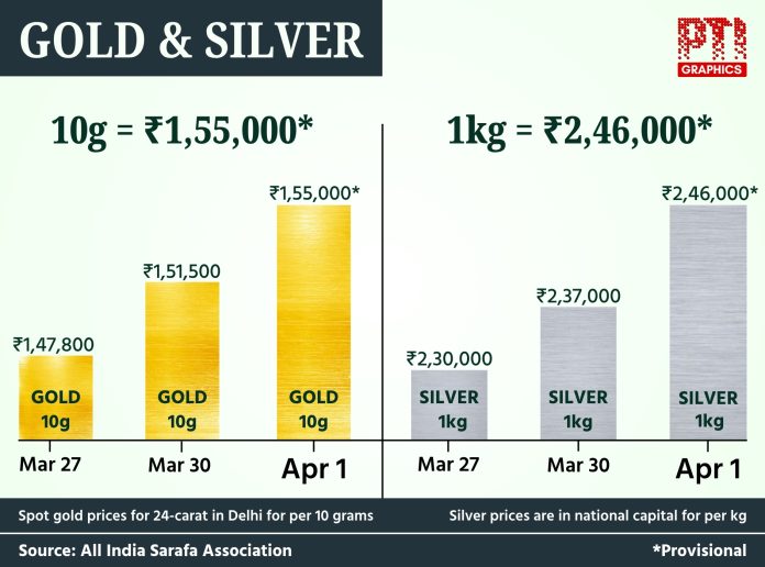 Gold and Silver Prices April 1, 2026 FacebookTwitterPinterestWhatsApp NEW DELHI: GOLD & SILVER. PTI GRAPHICS.(PTI04_01_2026_001010007B) Gold and Silver Prices NEW DELHI: GOLD & SILVER. PTI GRAPHICS.(PTI04_01_2026_001010007B)