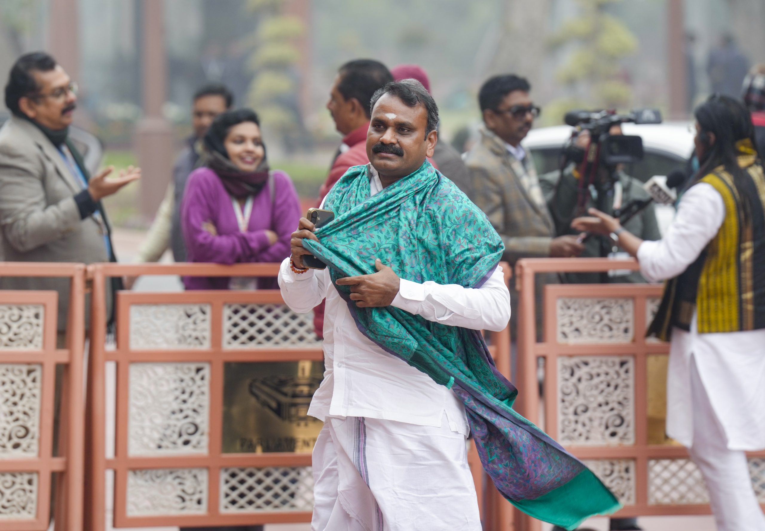New Delhi: Union Minister of State L. Murugan arrives during the Budget session of Parliament, in New Delhi, Monday, Feb. 2, 2026. (PTI Photo/Shahbaz Khan) (PTI02_02_2026_000053B)
