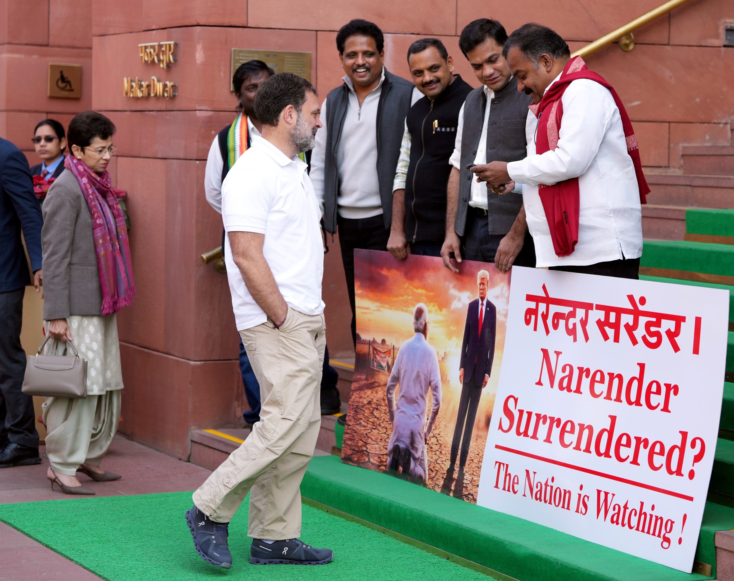 New Delhi: LoP in the Lok Sabha Rahul Gandhi, centre, arrives as Lok Sabha MPs who were suspended last week for the remainder of the Budget session for "unruly behaviour'', stage a protest at Parliament premises, in New Delhi, Tuesday, Feb. 10, 2026. (PTI Photo/Ravi Choudhary)(PTI02_10_2026_000087B)