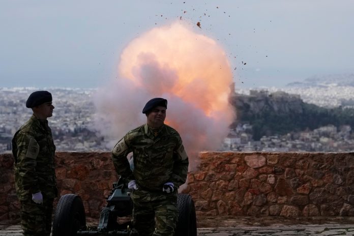 Greek soldiers fire a cannon during celebrations commemorating the start of Greece’s 1821 war of independence against the 400-year Ottoman rule, in Athens, on Wednesday, March 25, 2026. AP/PTI(AP03_25_2026_000244B)