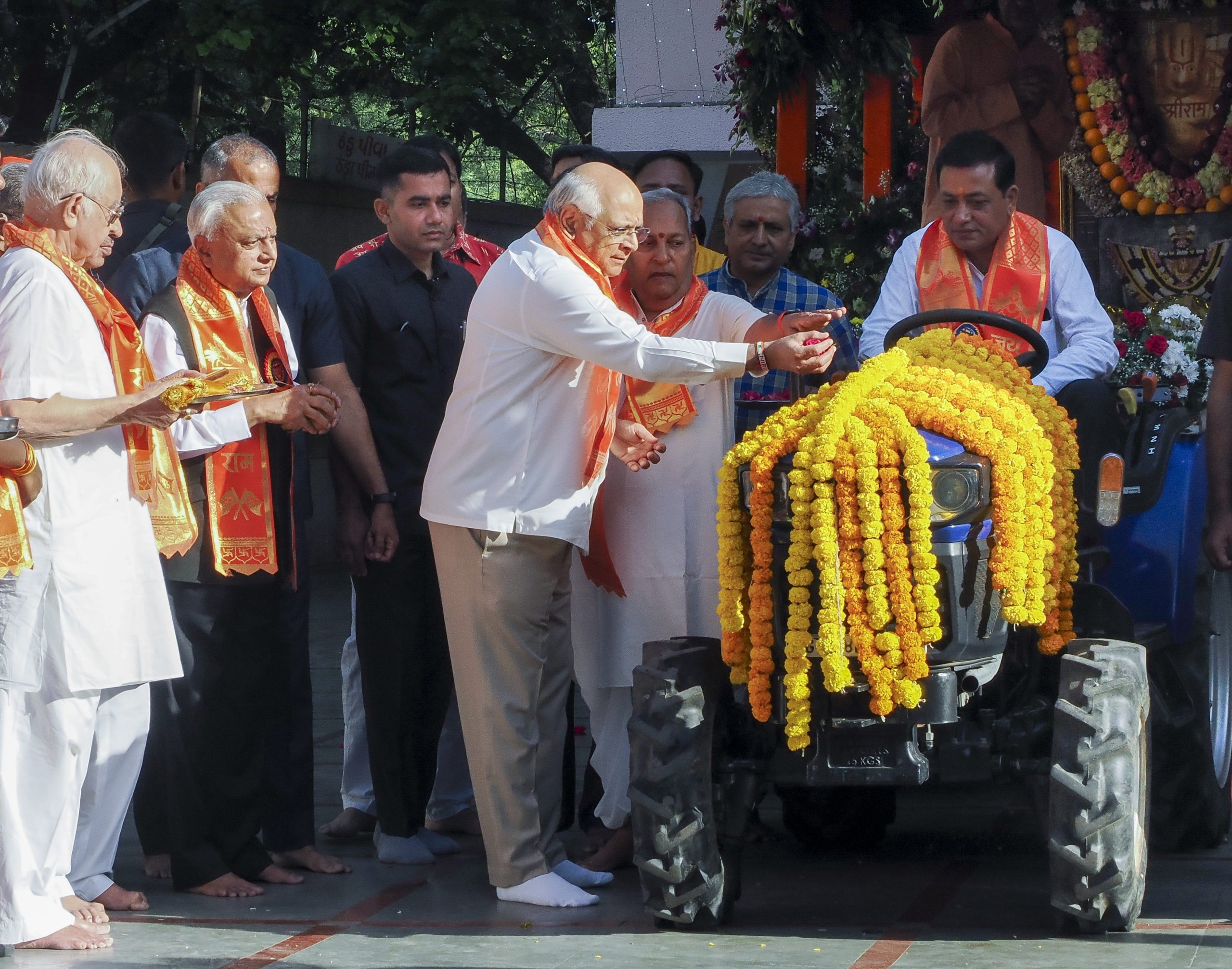 Ahmedabad: Gujarat Chief Minister Bhupendra Patel performs a ritual during the flagging off ceremony of the Shri Hanuman Rath Yatra at Camp Hanuman Temple, in Ahmedabad, Wednesday, April 1, 2026. (PTI Photo)(PTI04_01_2026_000111B)