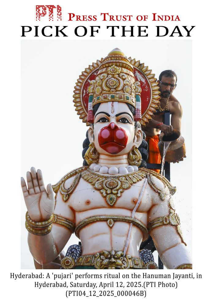 PLS TAKE NOTE OF THIS PTI PICK OF THE DAY::: Hyderabad: A ‘pujari’ performs ritual on the Hanuman Jayanti, in Hyderabad, Saturday, April 12, 2025. (PTI Photo)(PTI04_12_2025_000046B)(PTI04_12_2025_000490B)