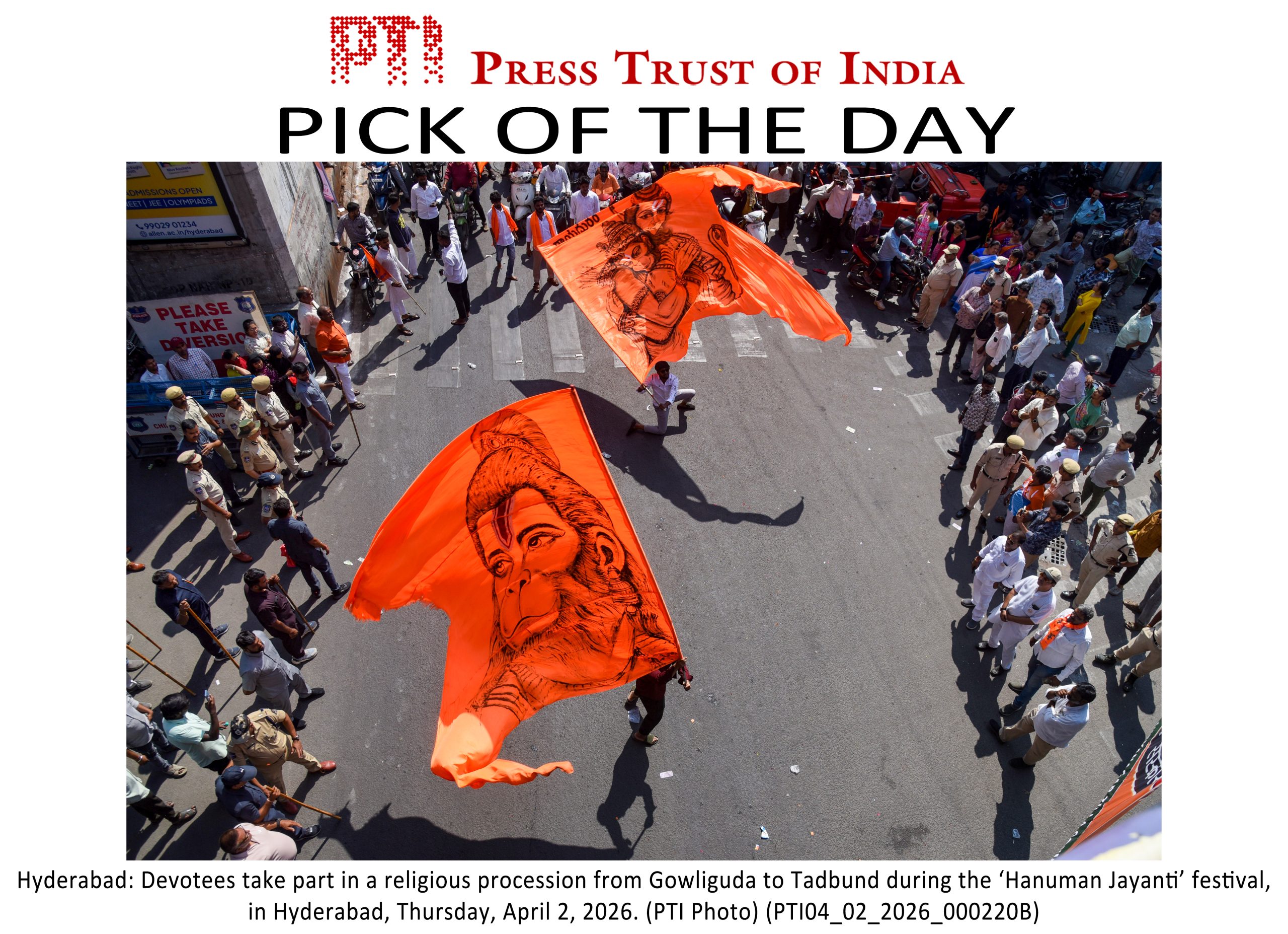 PLS TAKE NOTE OF THIS PTI PICK OF THE DAY::: Hyderabad: Devotees take part in a religious procession from Gowliguda to Tadbund during the �Hanuman Jayanti� festival, in Hyderabad, Thursday, April 2, 2026. (PTI Photo) (PTI04_02_2026_000220B)(PTI04_02_2026_000271B)