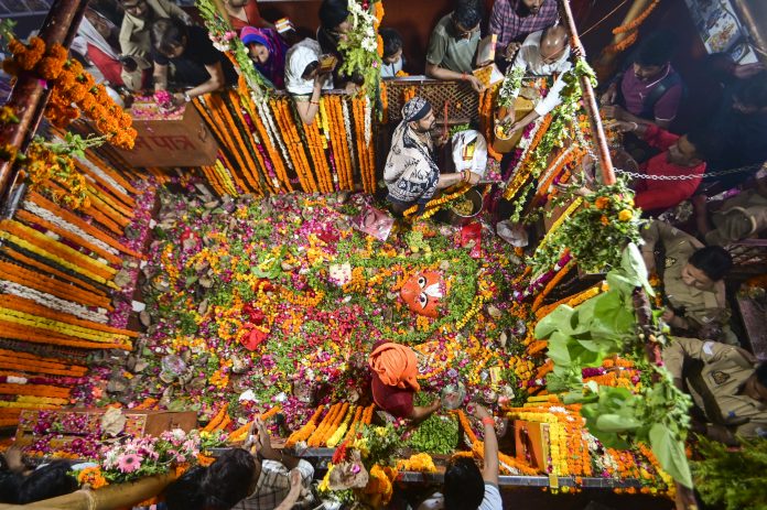 Prayagraj: People offer prayers on the occasion of Hanuman Jayanti at the Bade Hanuman ji temple, in Prayagraj, Saturday, April 12, 2025. (PTI Photo)(PTI04_12_2025_000029B) *** Local Caption ***