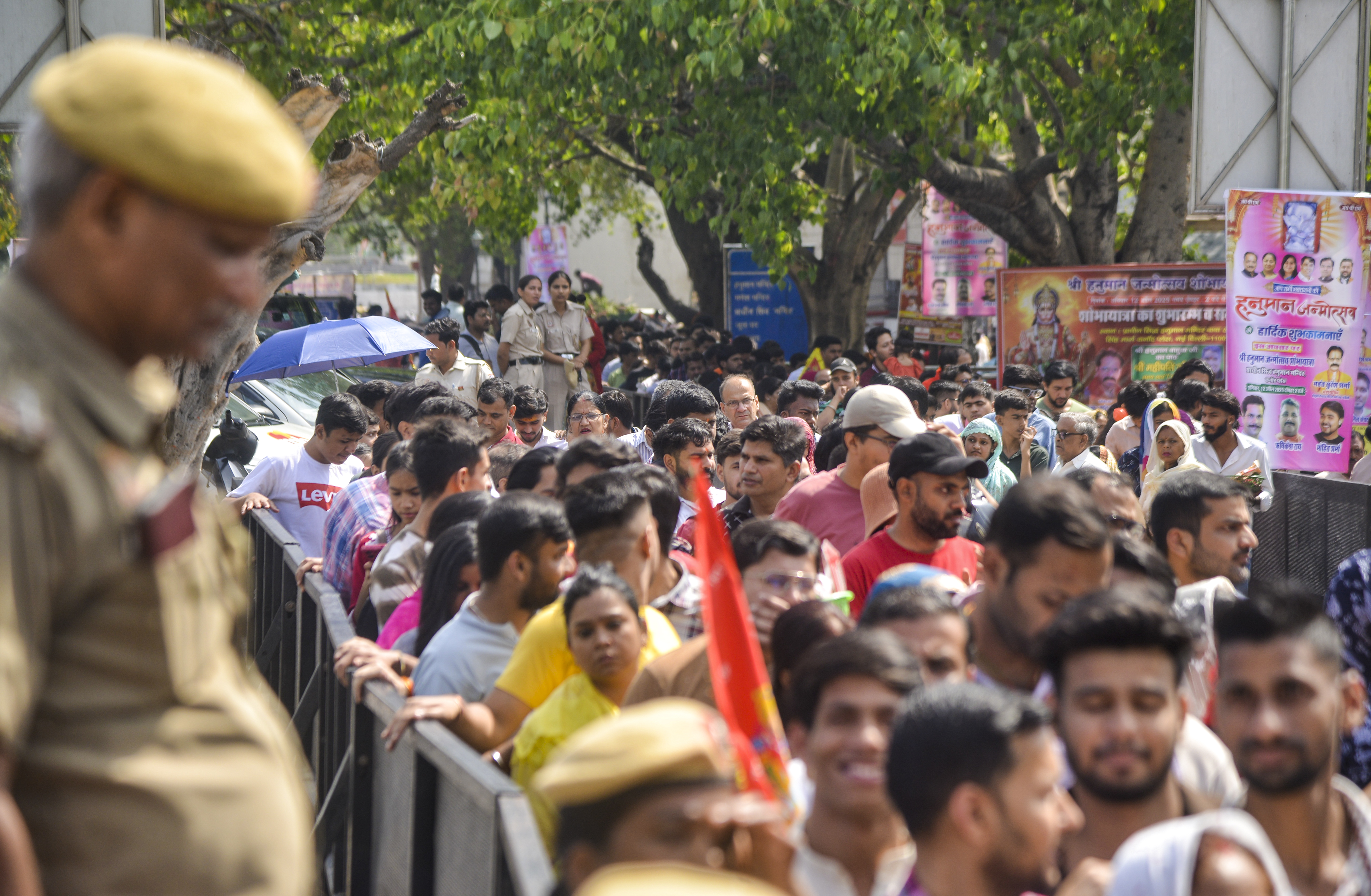 New Delhi: Devotees gather to offer prayers on the occasion of Hanuman Jayanti, at the Hanuman temple, Connaught Place, in New Delhi, Saturday, April 12, 2025. (PTI Photo) (PTI04_12_2025_000032B)