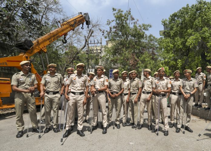 New Delhi: Police personnel stand guard during a Hanuman Jayanti procession, at Jahangirpuri in New Delhi, Saturday, April 12, 2025. (PTI Photo)(PTI04_12_2025_000113B)