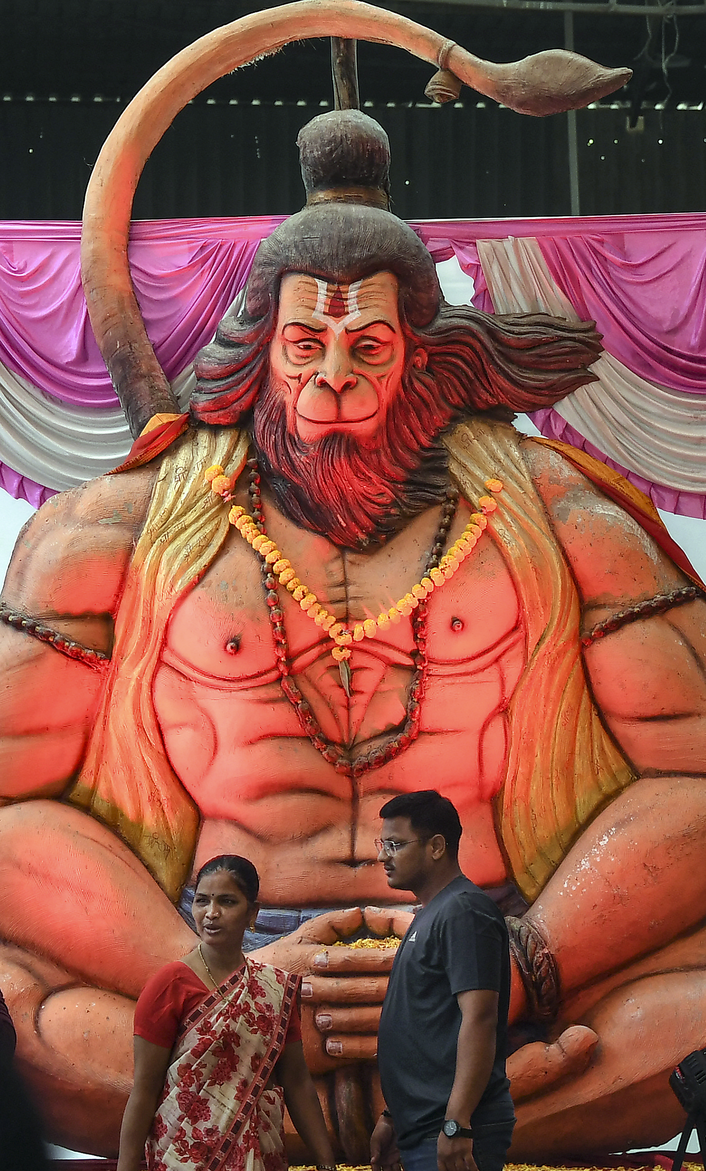 Mumbai: People take pictures in front of an idol of Lord Hanuman, on the occasion of �Hanuman Jayanti� festival, in Mumbai, Maharashtra, Saturday, April 12, 2025. (PTI Photo) (PTI04_12_2025_000515B)
