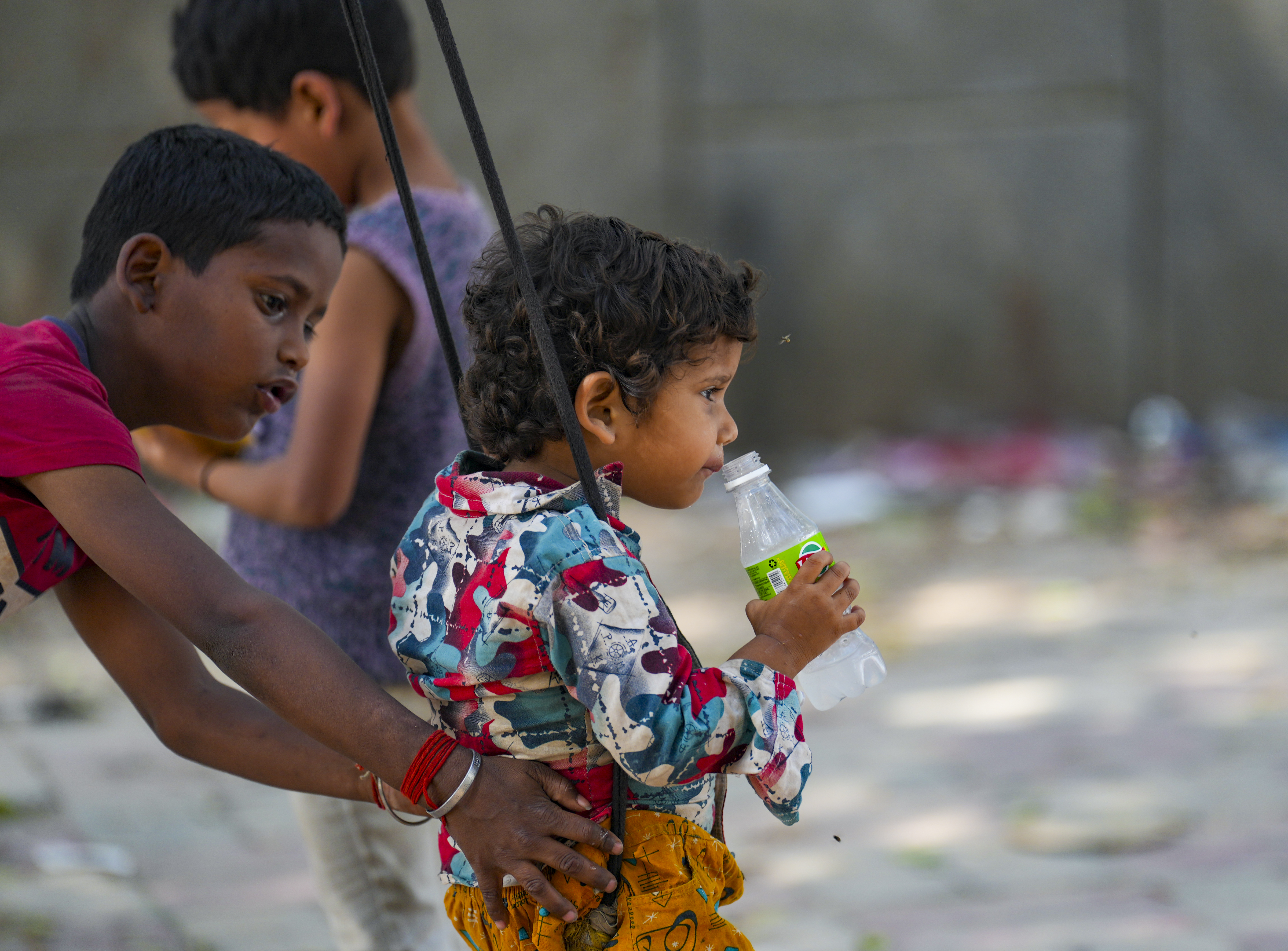 New Delhi: A child sips a soft drink while riding a swing during a hot summer afternoon, in New Delhi, Tuesday, April 8, 2025. The India Meteorological Department (IMD) has issued a 'yellow' alert for the national capital, forecasting a heatwave till Wednesday. (PTI Photo/Kamal Singh)(PTI04_08_2025_000365B)