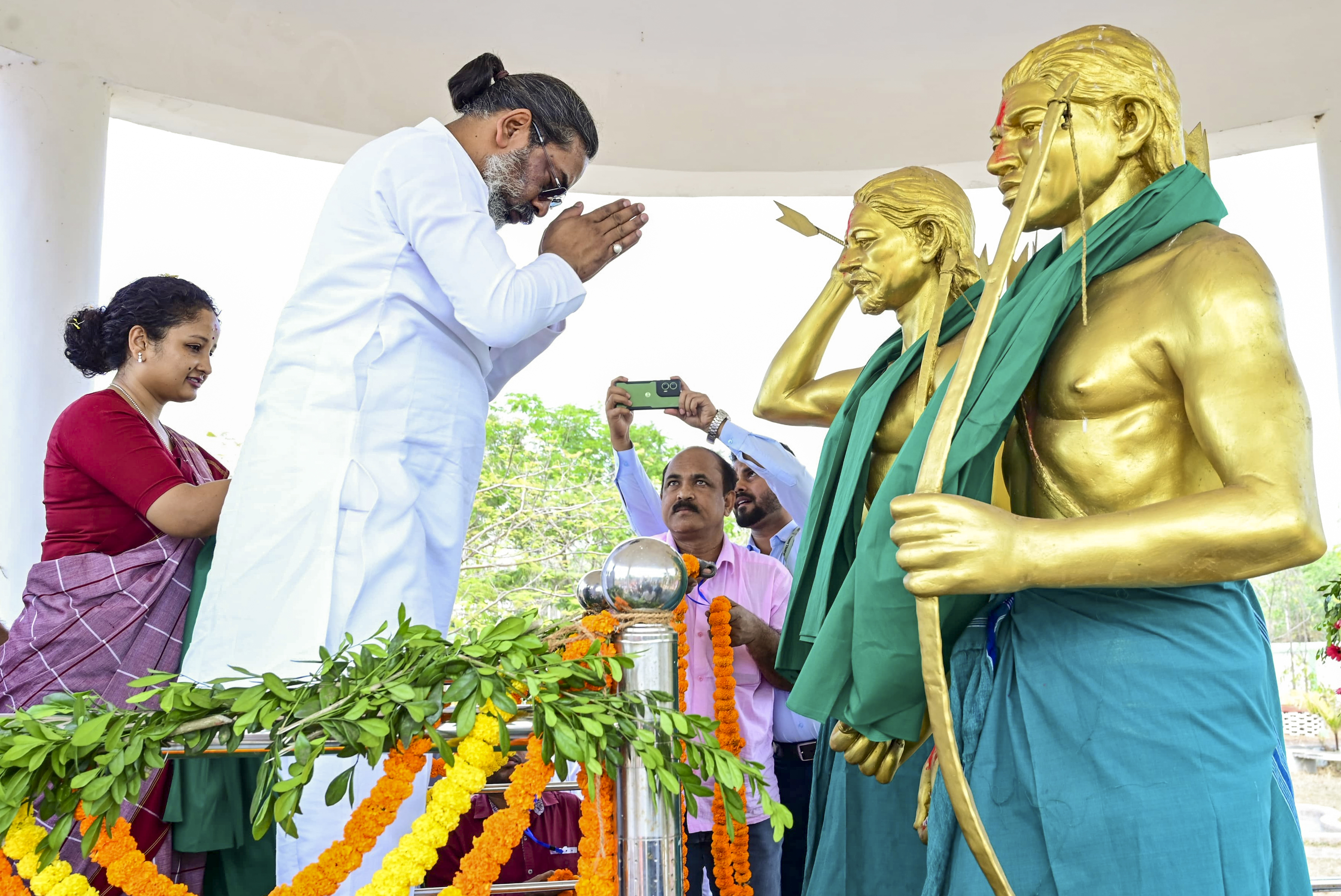 **EDS: THIRD PARTY IMAGE** In this image by JHARKHAND CMO, Jharkhand Chief Minister Hemant Soren pays tribute to Santhal rebellion leaders Sidhu-Kanhu Murmu, at Sahibganj district of Jharkhand, Friday, April 11, 2025. (JHARKHAND CMO via PTI Photo)(PTI04_11_2025_000140B)