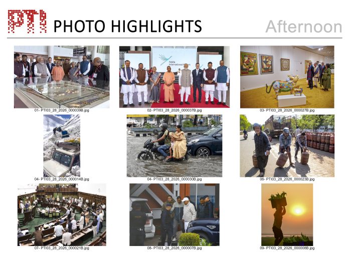 **EDS: HIGHLIGHTS’ CONTACT SHEET - IMAGES RELEASED TILL AFTERNOON** 01- PTI03_28_2026_000039B **EDS: THIRD PARTY IMAGE** In this screengrab from a video posted on March 28, 2026, Prime Minister Narendra Modi with Union Civil Aviation Minister Kinjarapu Ram Mohan Naidu, Uttar Pradesh Chief Minister Yogi Adityanath, Governor Anandiben Patel, and others, during inauguration of the newly constructed Noida International Airport, in Noida, Uttar Pradesh. (@NarendraModi/YT via PTI Photo)(PTI03_28_2026_000039B) 02- PTI03_28_2026_000037B **EDS: THIRD PARTY IMAGE** In this screengrab from a video posted on March 28, 2026, Prime Minister Narendra Modi with Union Civil Aviation Minister Kinjarapu Ram Mohan Naidu, Uttar Pradesh Chief Minister Yogi Adityanath, Governor Anandiben Patel, and others, during inauguration of the newly constructed Noida International Airport, in Noida, Uttar Pradesh. (@NarendraModi/YT via PTI Photo)(PTI03_28_2026_000037B) 03- PTI03_28_2026_000027B **EDS: THIRD PARTY IMAGE** In this image posted on March 28, 2026, Union External Affairs Minister S Jaishankar during his visit to the Swami Vivekananda Cultural Centre, in Paris, France. (@DrSJaishankar/X via PTI Photo)(PTI03_28_2026_000027B) 04- PTI03_28_2026_000014B **EDS: THIRD PARTY IMAGE** In this screengrab from a video received on March 27, 2026, vehicles trapped under snow following multiple avalanches that hit the Srinagar-Leh national highway near Zojila Pass, in Jammu and Kashmir. Seven people were killed. (Handout via PTI Photo)(PTI03_28_2026_000014B) 04- PTI03_28_2026_000030B Guwahati: Commuters wade through a waterlogged road following rainfall, in Guwahati, Assam, Saturday, March 28, 2026. (PTI Photo)(PTI03_28_2026_000030B) 06- PTI03_28_2026_000023B Kanpur: People carry refilled LPG cylinders from a distribution centre amid ongoing supply crunch, in Kanpur, Uttar Pradesh, Saturday, March 28, 2026. (PTI Photo)(PTI03_28_2026_000023B) 07- PTI03_28_2026_000021B Jammu: Jammu and Kashmir N