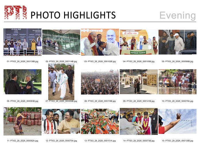 **EDS: HIGHLIGHTS’ CONTACT SHEET - IMAGES RELEASED TILL EVENING** 01- PTI03_28_2026_000138B **EDS: THIRD PARTY IMAGE** In this image posted on March 28, 2026, Prime Minister Narendra Modi with Union Civil Aviation Minister Kinjarapu Ram Mohan Naidu, Uttar Pradesh Chief Minister Yogi Adityanath, Deputy CM Keshav Prasad Maurya, Governor Anandiben Patel, and others, during inauguration of the Noida International Airport, in Jewar, Gautam Buddha Nagar district, Uttar Pradesh. (@CMOfficeUP/X via PTI Photo)(PTI03_28_2026_000138B) 02- PTI03_28_2026_000114B **EDS: THIRD PARTY IMAGE** In this image received on March 28, 2026, Prime Minister Narendra Modi with Union Civil Aviation Minister Kinjarapu Ram Mohan Naidu, Uttar Pradesh Governor Anandiben Patel, and others, during inauguration of the newly constructed Noida International Airport, in Noida, Uttar Pradesh. (PMO via PTI Photo)(PTI03_28_2026_000114B) 03- PTI03_28_2026_000102B Kolkata: Union Home Minister Amit Shah being greeted by LoP in the West Bengal Assembly Suvendu Adhikari, in Kolkata, West Bengal, Saturday, March 28, 2026. (PTI Photo/Swapan Mahapatra)(PTI03_28_2026_000102B) 04- PTI03_28_2026_000105B Kolkata: Union Home Minister Amit Shah releases a 'charge sheet' against the TMC government, in Kolkata, West Bengal, Saturday, March 28, 2026. LoP in the West Bengal Assembly Suvendu Adhikari, MoS Sukanta Majumdar, and state party president Samik Bhattacharya are also seen. (PTI Photo/Swapan Mahapatra)(PTI03_28_2026_000105B) 05- PTI03_28_2026_000088B Bhaktapur: Nepal's Former Prime Minister K P Sharma Oli leaves for a health checkup after being detained from his residence, in Bhaktapur, Nepal, Saturday, March 28, 2026. Oli has been arrested on charges of involvement in suppressing the Gen Z movement of September 8 and 9 last year, in which 76 people were killed. (PTI Photo/Abhishek Maharjan)(PTI03_28_2026_000088B) 06- PTI03_28_2026_000083B **EDS: THIRD PARTY IMAGE** In this image posted on March 28, 2026, Un