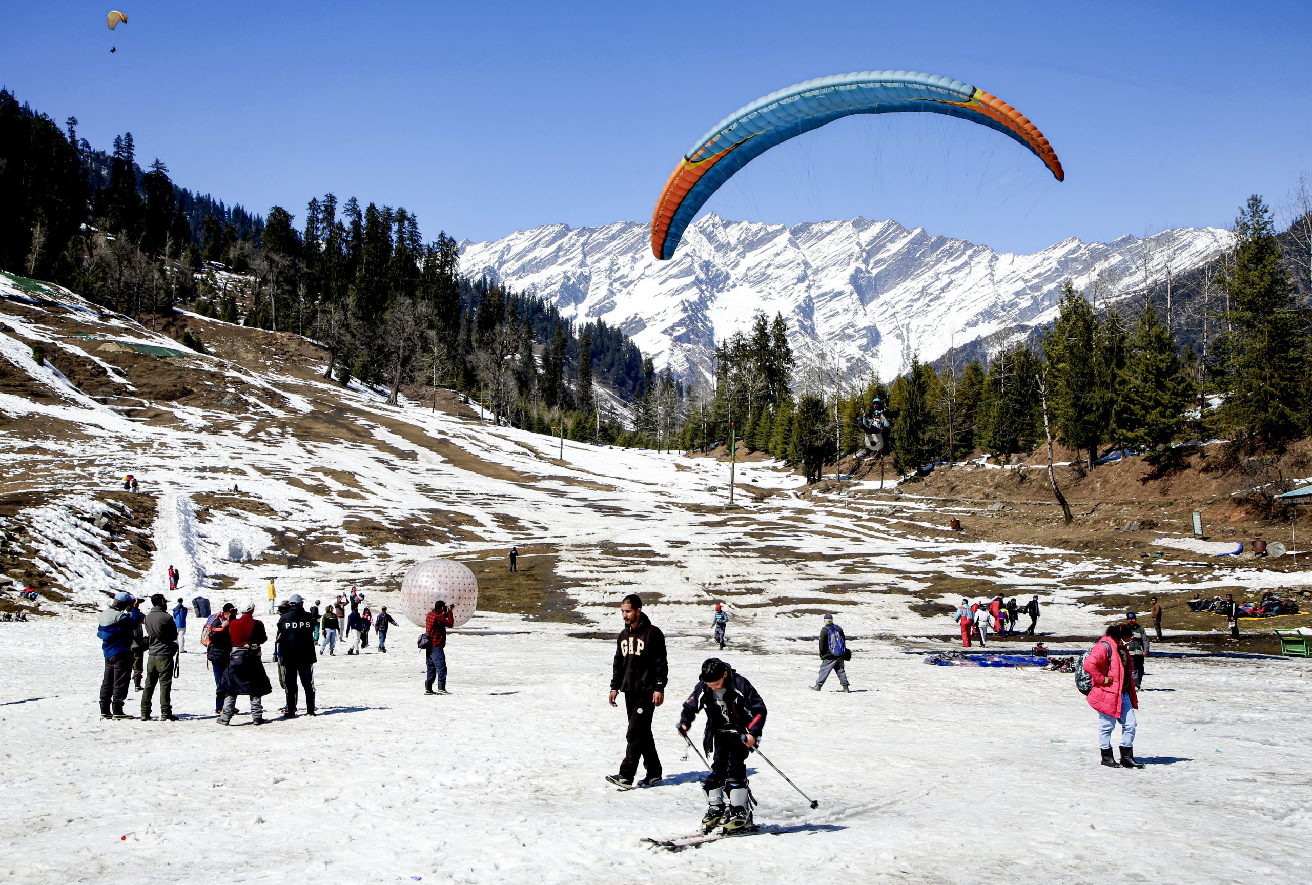 Solang Valley: A paraglider soars above tourists participating in activities, in Solang Valley, Himachal Pradesh, Sunday, Feb. 22, 2026. (PTI Photo)(PTI02_22_2026_000226B)