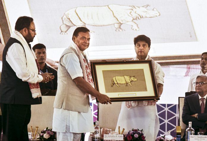 Guwahati: Union Minister Jyotiraditya Scindia being felicitated by Assam Chief Minister Himanta Biswa Sarma during a programme to mark the simultaneous launch of BSNL's indigenous 4G stack across the country by Prime Minister Narendra Modi from Odisha, in Guwahati, Saturday, Sept. 27, 2025. (PTI Photo)(PTI09_27_2025_000253B)