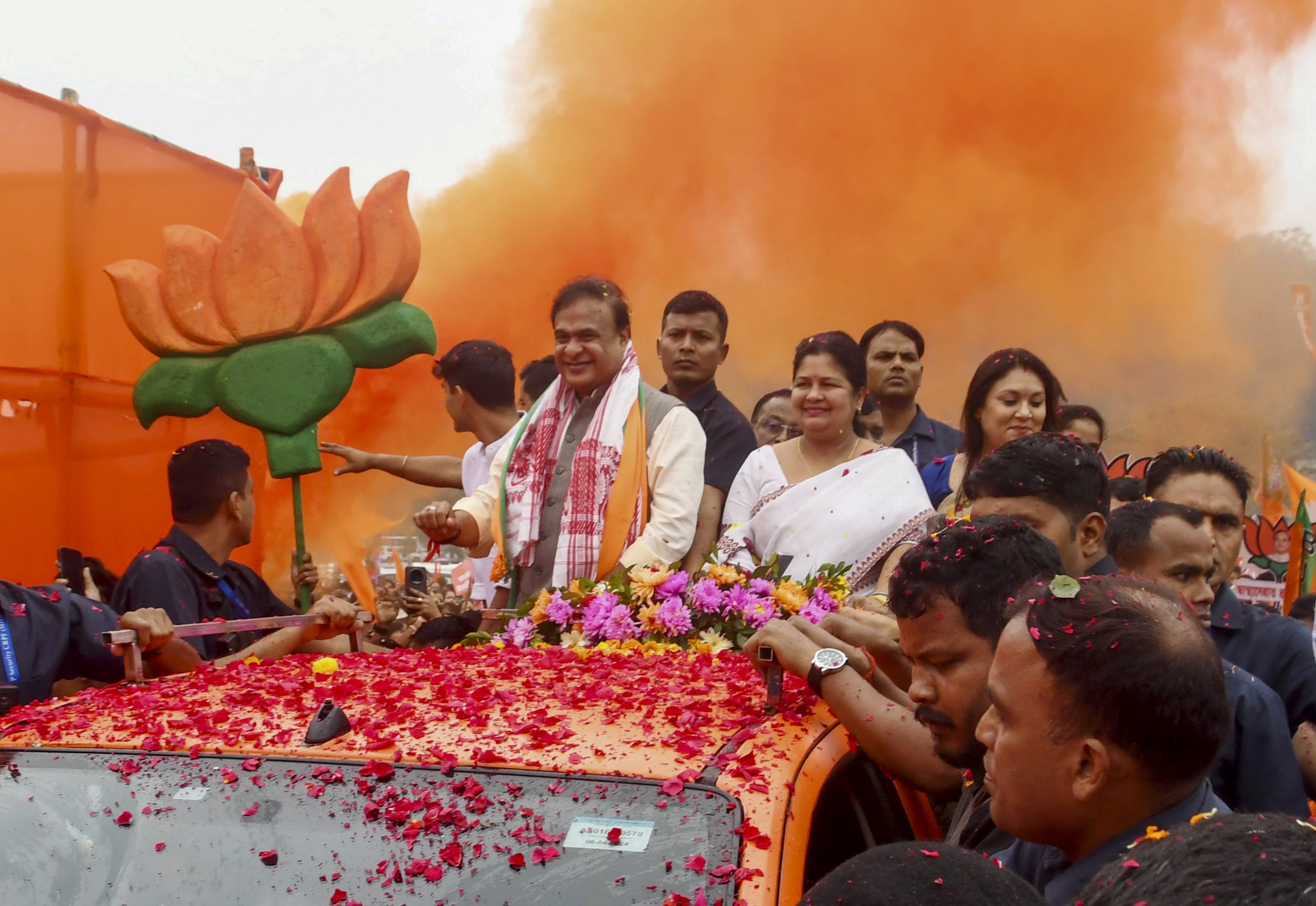 The procession began from the Veterinary Field in Khanapara area heading to the Kamrup (Metropolitan) District Election office, around 5.6 kms away, with Himanta atop a vehicle, flanked by his wife Riniki Bhuyan Sarma, son Nandil Biswa Sarma and the BJP’s Gauhati Lok Sabha MP Bijuli Kalita Medhi.