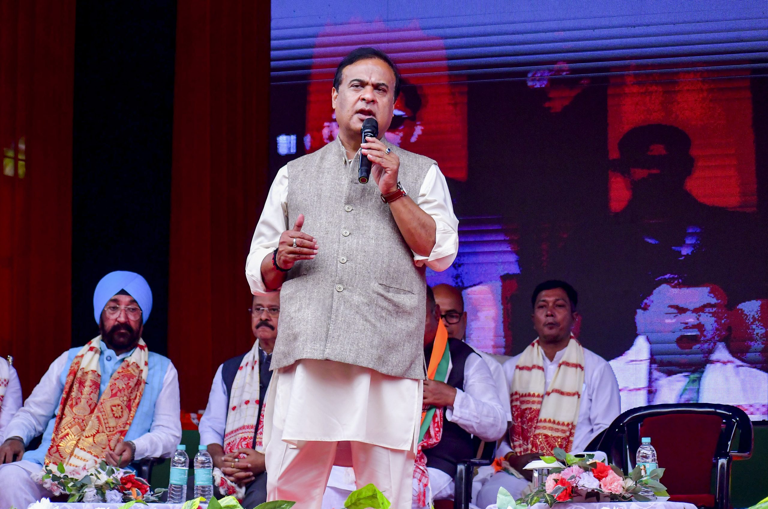 Nagaon: Assam Chief Minister Himanta Biswa Sarma addresses a public rally in support of BJP candidate from Raha constituency Sashi Kanta Das, unseen, ahead of the state Assembly Election, in Nagaon district, Tuesday, March 31, 2026. (PTI Photo)(PTI03_31_2026_000191B)
