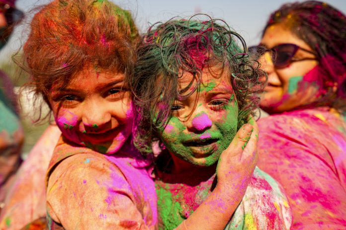 Amritsar: Children daubed in vibrant colours during celebrations for the ‘Holi’ festival, at Shri Durgiana Temple in Amritsar, Monday, March 2, 2026. (PTI Photo/Shiva Sharma) (PTI03_02_2026_000206B)
