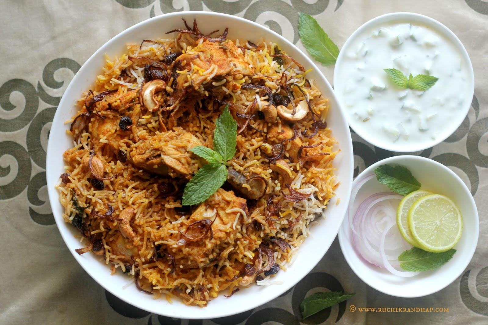 Hyderabadi Biryani is a type of biryani which originated in the Hyderabad city of India. Hyderabadi biryani is famous in countries like India, Pakistan, and Middle Eastern countries. As rice is the staple food of most regions of India, it is the main ingredient of this dish. Hyderabadi Biryani is main course dish served with accompaniments such as a green chilly curry, Dahi Chutney (yogurt mixed with mint and onions) and salad.