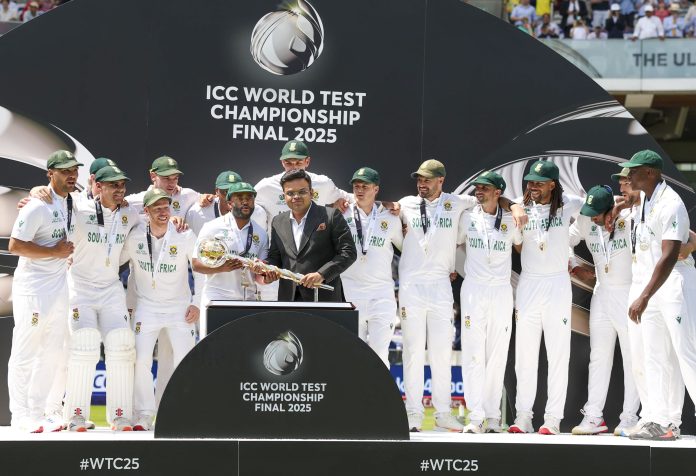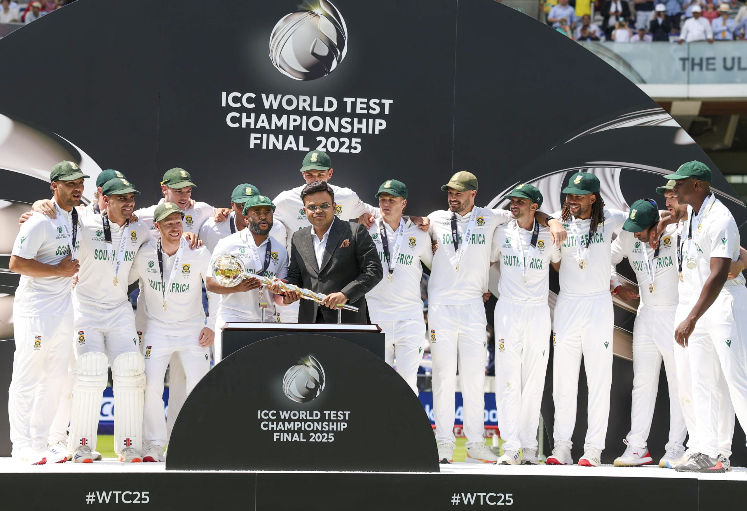**EDS: THIRD PARTY IMAGE** In this image posted by @JayShah via X on June 14, 2025, International Cricket Council (ICC) Chairman Jay Shah hands over the championship mace to South African team players after they won the World Test Championship against titleholder Australia, at Lord’s, in London. (@JayShah on X via PTI Photo) (PTI06_14_2025_000320B)
