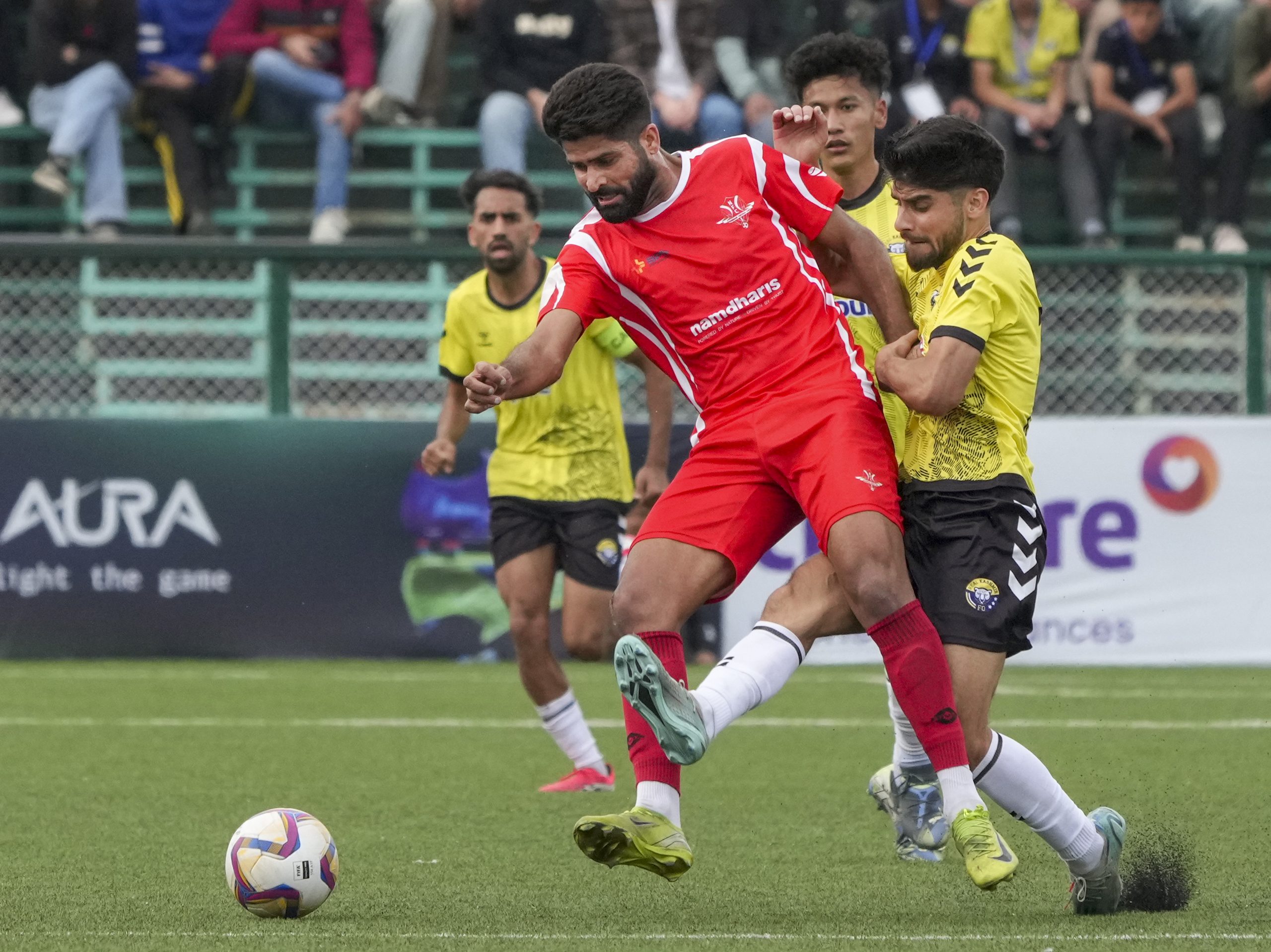 Srinagar: Players of Real Kashmir Football Club (RKFC), in yellow, and Namdhari FC (NFC) vie for the ball during an India Football League (IFL) match, in Srinagar, Wednesday, March 25, 2026. (PTI Photo/S Irfan) (PTI03_25_2026_000385B)