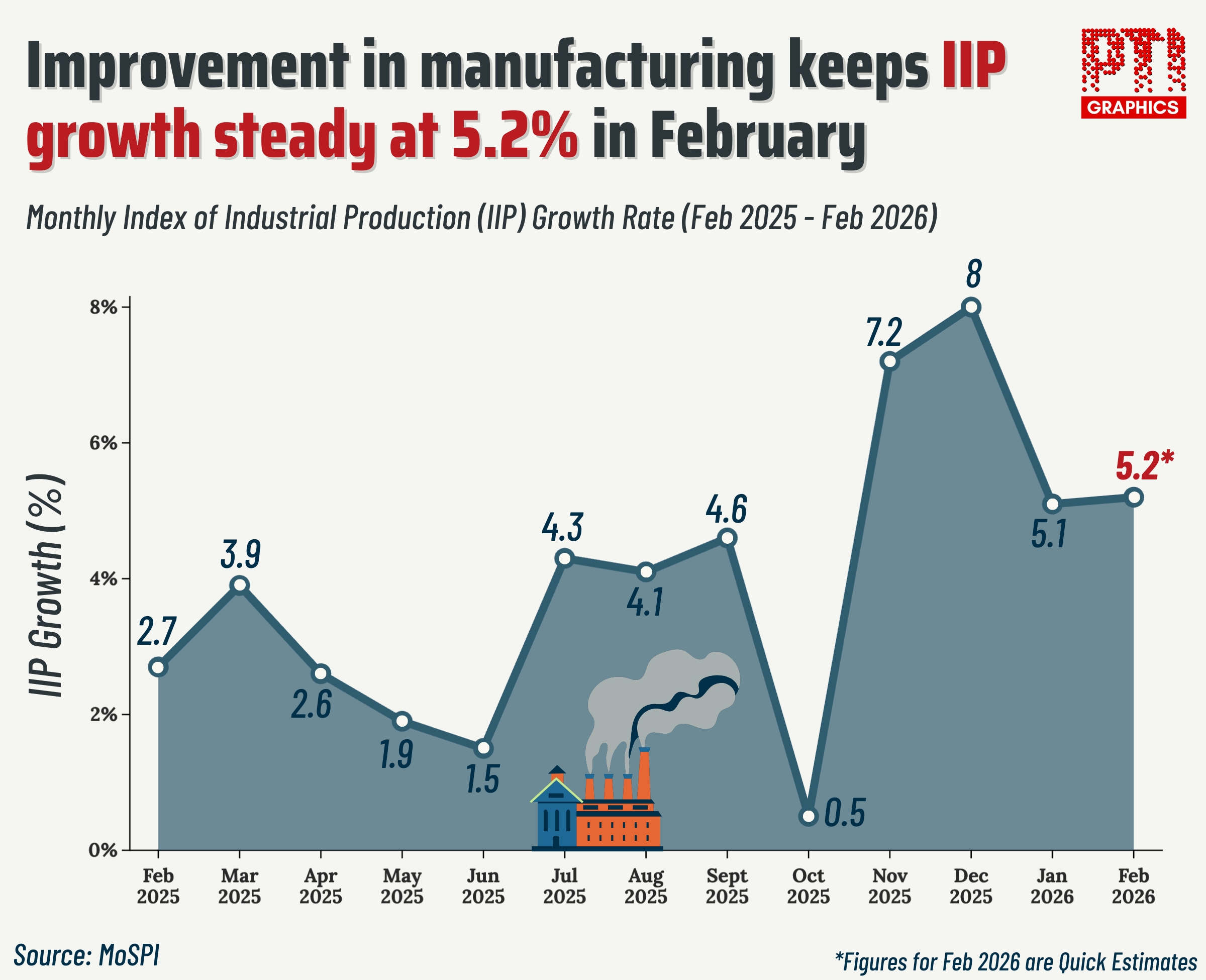 India’s industrial production grew 5.2 per cent in February, mainly due to an improvement in manufacturing output, according to official data released on March 30. The factory output, measured in terms of the Index of Industrial Production (IIP), expanded by 2.7 per cent in February 2025, an official statement said. The National Statistics Office (NSO) revised the industrial production growth for January 2026 to 5.1 per cent from the provisional estimate of 4.8 per cent released earlier this month. PTI GRAPHICS.(PTI03_30_2026_001010001B)