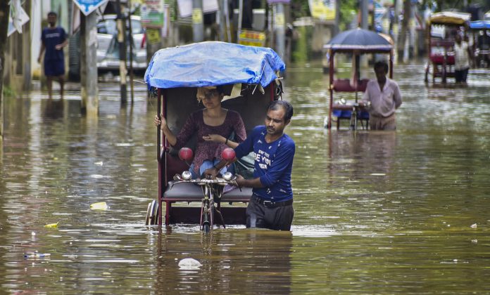 Guwahati: A rickshaw puller carries a passenger through a flooded area after heavy rainfall, in Guwahati, Tuesday, July 22, 2025. (PTI Photo) (PTI07_22_2025_000148B)