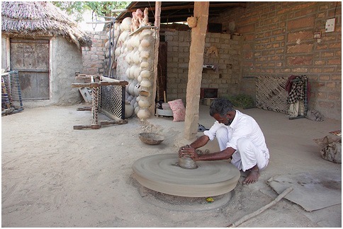 The clay used is from the banks of the Banas River which is cleaned and stored. The mud is turned beautifully in the wheel and after a desired shape is achieved, it is cut from the bottom using a thread. The potter then uses his skill to smoothen and polish the product which is then dried and finally fired. The greyish black hue in the pottery is the speciality of Sawai Madhopur.