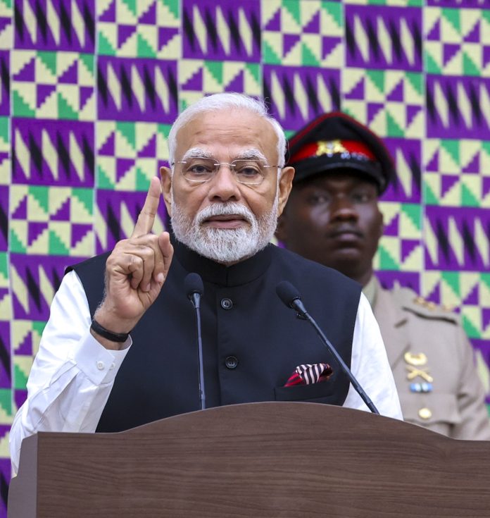 **EDS: THIRD PARTY IMAGE** In this image via PMO on July 3, 2025, Prime Minister Narendra Modi addresses at the Parliament of Ghana. (PMO via PTI Photo) (PTI07_03_2025_000303B)