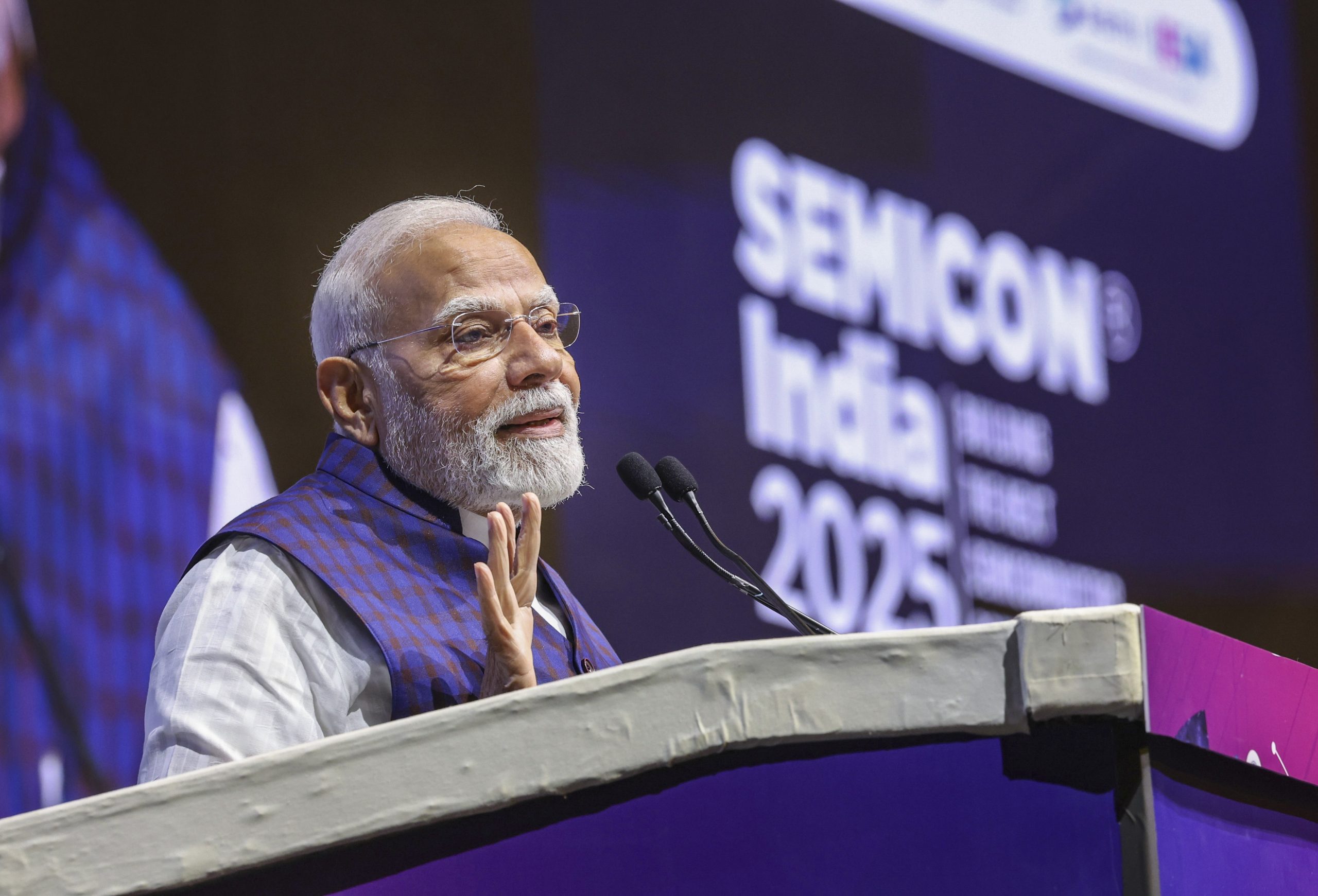 **EDS: THIRD PARTY IMAGE** In this image received on Sep. 02, 2025, Prime Minister Narendra Modi addresses the gathering during the inauguration of 'Semicon India 2025' at Yashobhoomi, in New Delhi. (PMO via PTI Photo)(PTI09_02_2025_000068B)
