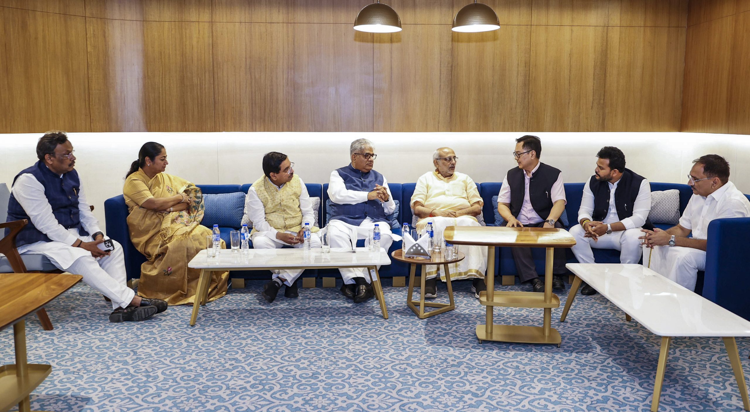 **EDS: THIRD PARTY IMAGE** In this image released by @gupta_rekha via X on Aug. 18, 2025, Maharashtra Governor and NDA's Vice-Presidential candidate CP Radhakrishnan with Union Ministers Kiren Rijiju, K Rammohan Naidu, Pralhad Joshi, Bhupender Yadav, Delhi Chief Minister Rekha Gupta, BJP National General Secretary Vinod Tawde and state BJP President Virendra Sachdeva during a meeting, in New Delhi. (@gupta_rekha on X via PTI Photo)(PTI08_18_2025_000190B)