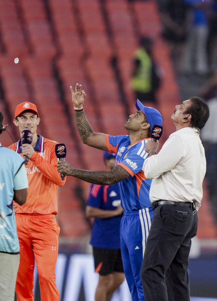 Ahmedabad: India's captain Suryakumar Yadav flips the coin as Netherlands' captain Scott Edwards takes the call during the toss before an ICC Men's T20 World Cup 2026 cricket match between India and Netherlands, at the Narendra Modi Stadium, in Ahmedabad, Wednesday, Feb. 18, 2026. Former cricketer Ravi Shastri is also seen. (PTI Photo/Kamal Kishore) (PTI02_18_2026_000535B)
