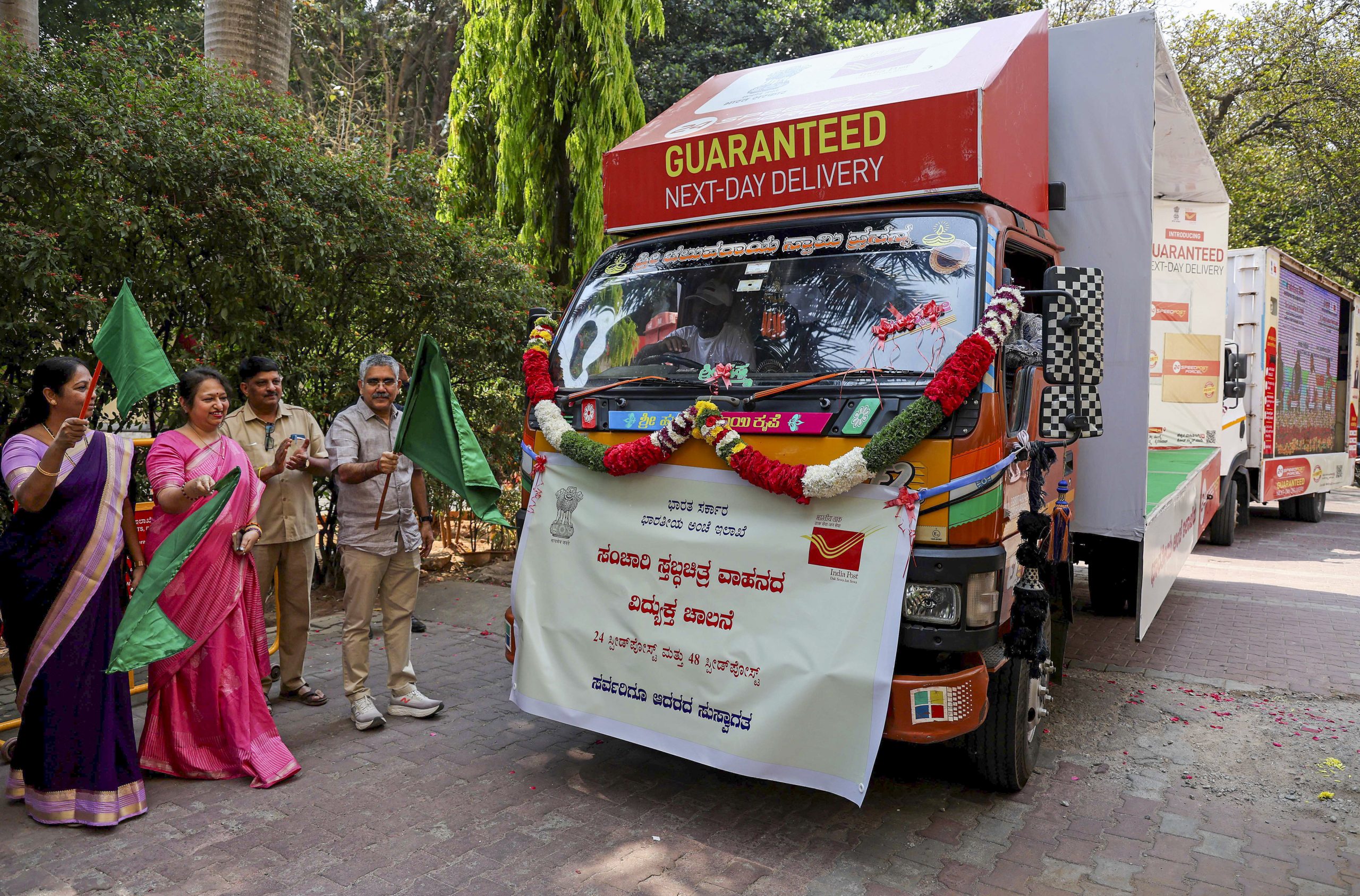 Bengaluru: Chief Postmaster General K Prakash and others flag off a Mobile Theatre Van to create awareness about the efficiency, affordability and wide reach of 24-hour and 48-hour Speed Post services at the General Post Office, in Bengaluru, Tuesday, March 24, 2026. (PTI Photo) (PTI03_24_2026_000330B)