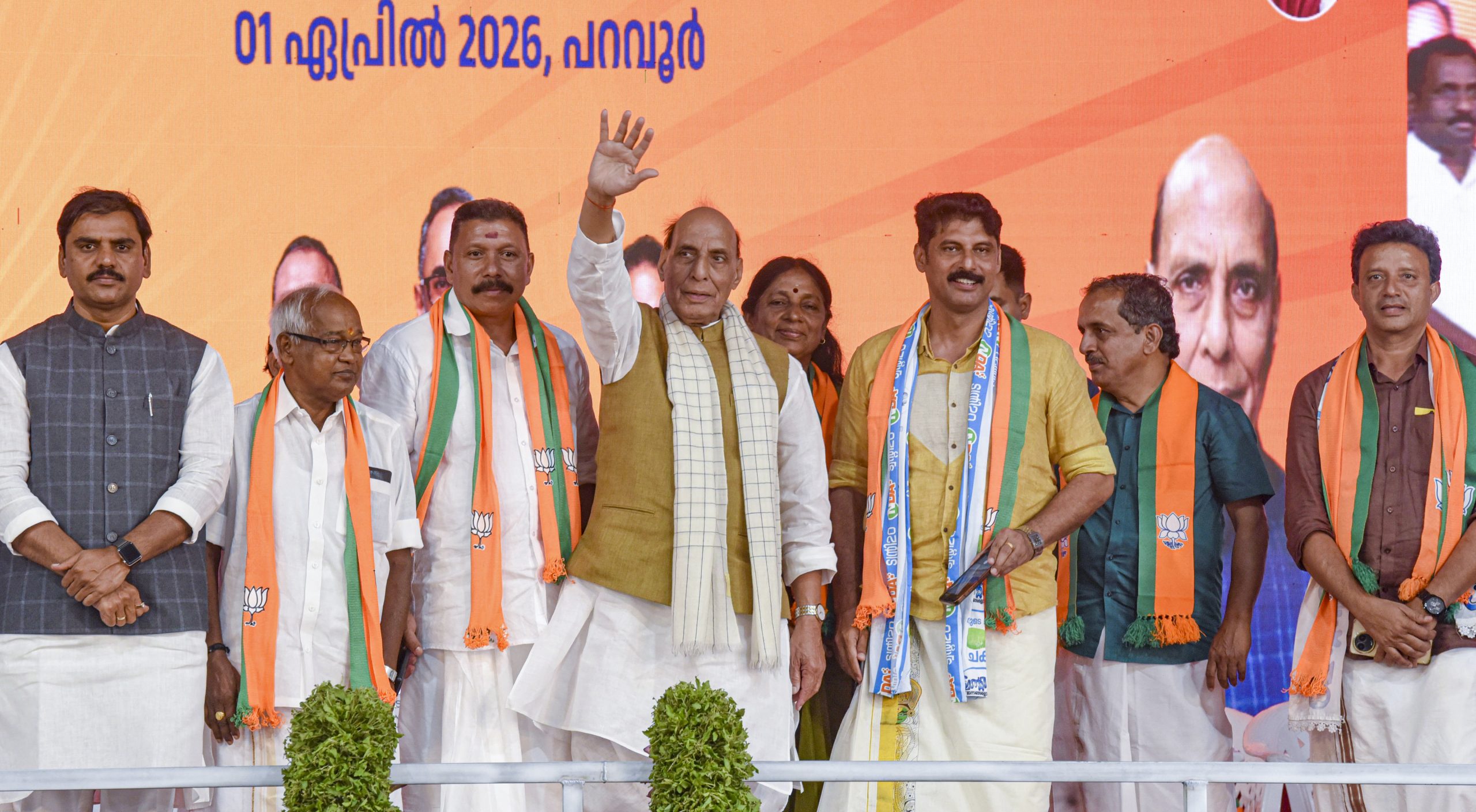 Kochi: Defence Minister Rajnath Singh during a public rally ahead of the Kerala Assembly elections, in Kochi, Wednesday, April 1, 2026. (PTI Photo) (PTI04_01_2026_000471B)