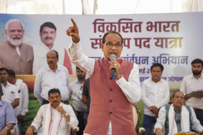 Sehore: Union Minister for Agriculture and Farmers Welfare Shivraj Singh Chouhan during his 'Viksit Bharat Sankalp Padyatra', in Sehore district, Madhya Pradesh, Monday, May 26, 2025. (PTI Photo)(PTI05_26_2025_000623B)