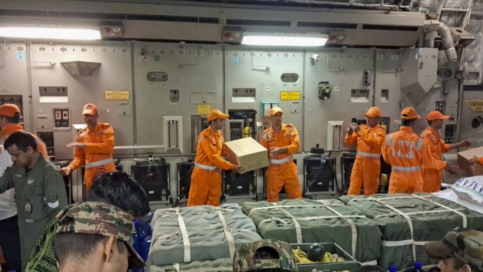 **EDS: THIRD PARTY** Mandalay: In this image posted by @DrSJaishankar via X on April 6, 2025, humanitarian aid being loaded onboard the Indian Air Force’s C-17 plane for Mandalay in the earthquake-hit Myanmar. (@DrSJaishankar vis PTI Photo)(PTI04_06_2025_000068B)