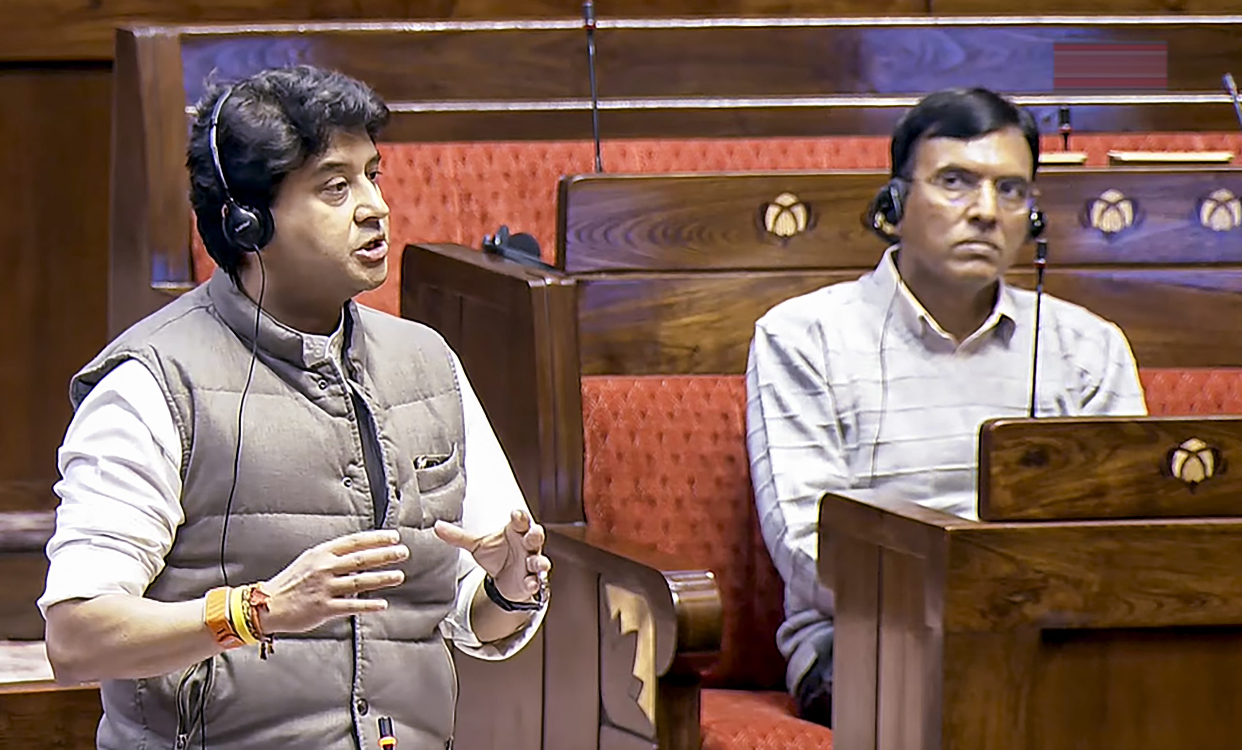 **EDS: THIRD PARTY IMAGE; SCREENGRAB VIA SANSAD TV** New Delhi: Union Minister Jyotiraditya Scindia speaks in the Rajya Sabha during the Winter session of Parliament, in New Delhi, Thursday, Dec. 18, 2025. Union Minister Mansukh L Mandaviya is also seen. (Sansad TV via PTI Photo)(PTI12_18_2025_000192B)