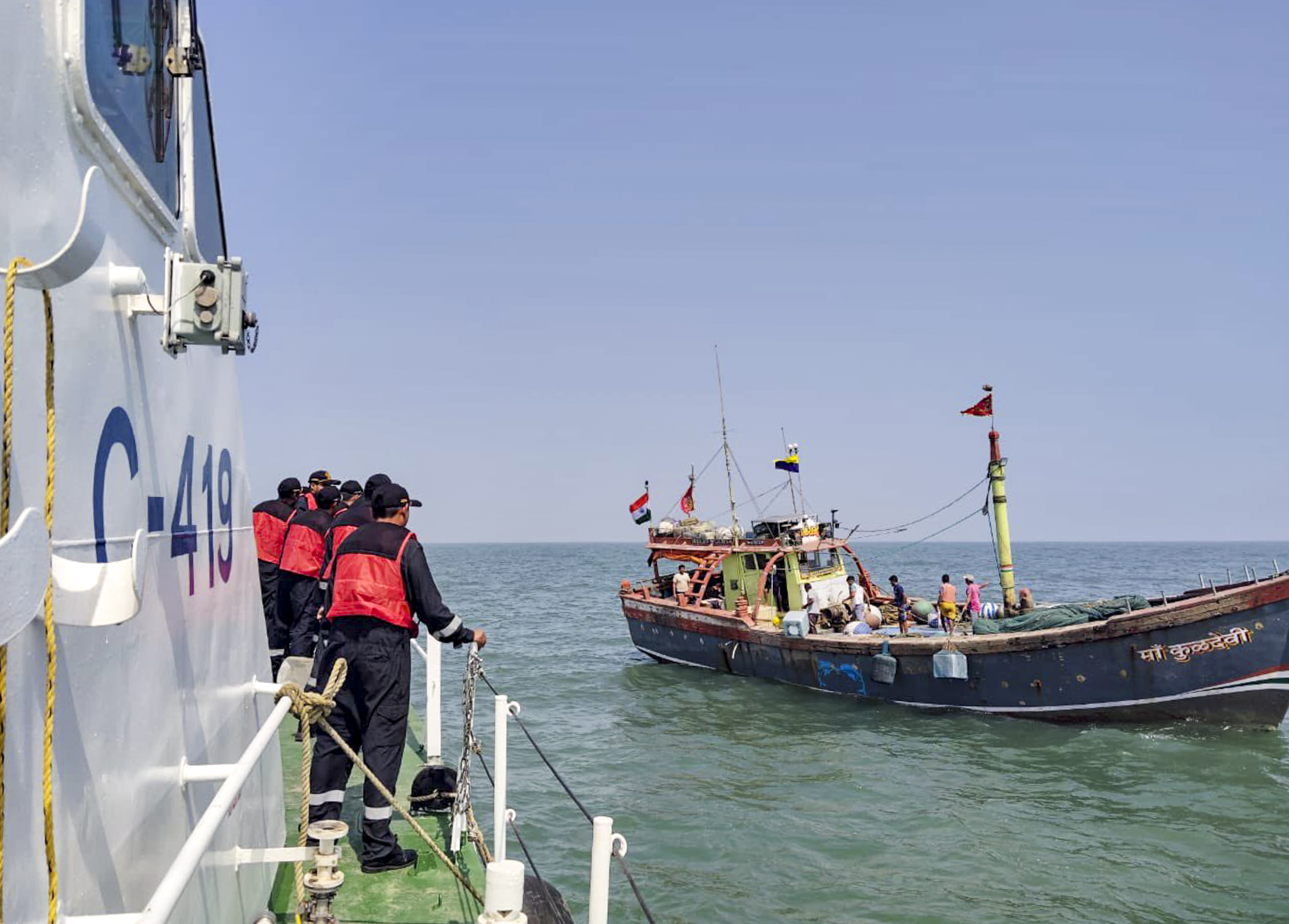 **EDS: THIRD PARTY IMAGE** In this image posted by @IndiaCoastGuard via X on Thursday, April 24, 2025 Indian Coast Guard personnel approach a fishing vessel to rescue a fisherman suffering from severe chest pain and seizures, approximately 90 km off Jafrabad, Gujarat. The patient was safely evacuated by ICG Ship C-419 and handed over to the fisheries association in Jafrabad for further medical care. (@IndiaCoastGuard via PTI Photo) (PTI04_24_2025_000334B)