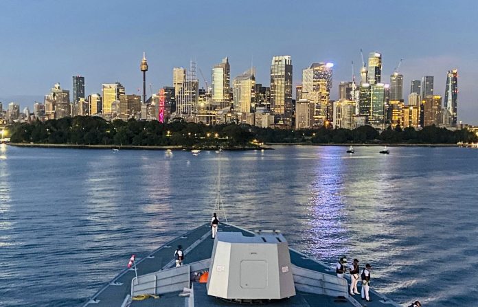 **EDS: THIRD PARTY IMAGE** In this image posted on March 24, 2026, Indigenous stealth frigate INS Nilgiri, the lead ship of India’s Project 17A, arrives to take part in an international fleet review being hosted by the Royal Australian Navy to mark its 125th anniversary, at Port Jackson, in Sydney. (@indiannavy/X via PTI Photo) (PTI03_24_2026_000294B)