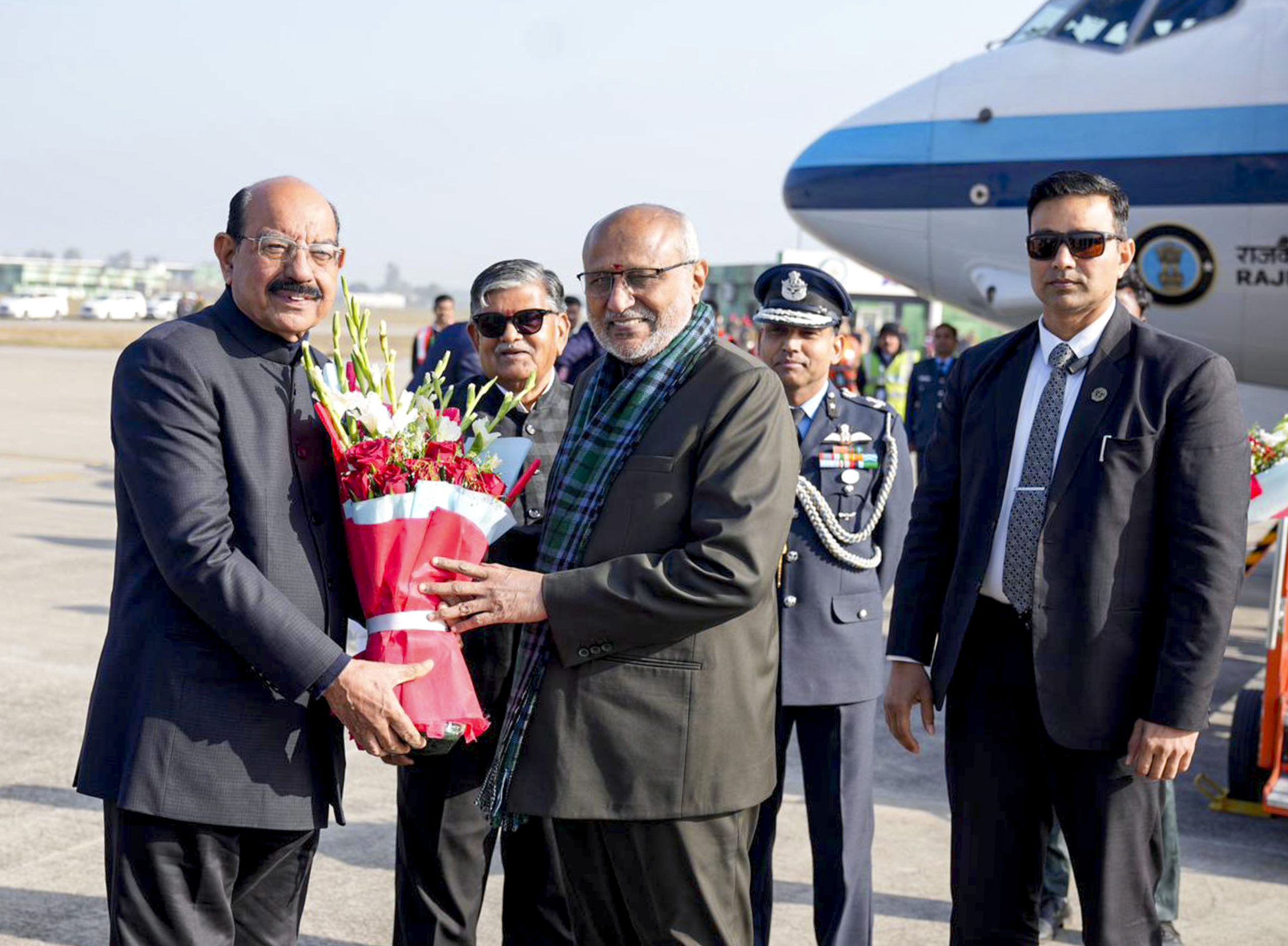 **EDS: THIRD PARTY IMAGE** In this image posted on Jan. 9, 2026, Vice President C. P. Radhakrishnan being welcomed by Punjab Minister Mohinder Bhagat upon his arrival at Adampur Airport, Jalandhar, Punjab. Governor Gulab Chand Kataria is also seen. (@VPIndia/X via PTI Photo)(PTI01_09_2026_000296B)