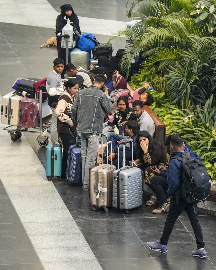 New Delhi: Passengers wait at Terminal 1 (T1) of the Indira Gandhi International Airport, in New Delhi, Saturday, Dec. 6, 2025. Domestic carrier IndiGo has cancelled over 200 flights from Delhi and Mumbai on Saturday, a day after managing to temporarily secure major relaxations in the second phase of the court-mandated new flight duty and rest period norms for cockpit crew, sources said. (PTI Photo/Salman Ali) (PTI12_06_2025_000054B)