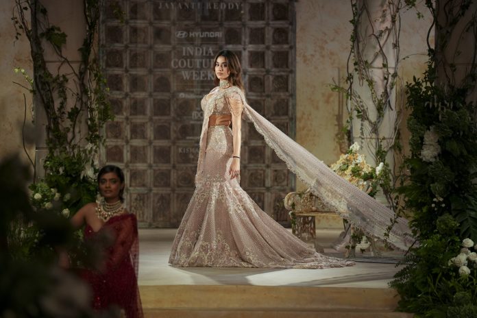 New Delhi: Bollywood actor Janhvi Kapoor walks the ramp showcasing a creation by fashion designer Jayanti Reddy during the FDCI India Couture Week 2025, in New Delhi, Monday, July 28, 2025. (PTI Photo/Karma Bhutia)(PTI07_29_2025_000077B)