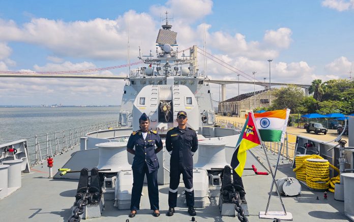 **EDS: THIRD PARTY IMAGE** In this image received on March 27, 2026, INS Trikand, a frontline guided missile frigate of the Indian Navy, arrived at Maputo, Mozambique, as part of her operational deployment to the South West Indian Ocean Region. (Defence PRO via PTI Photo) (PTI03_27_2026_000315B)