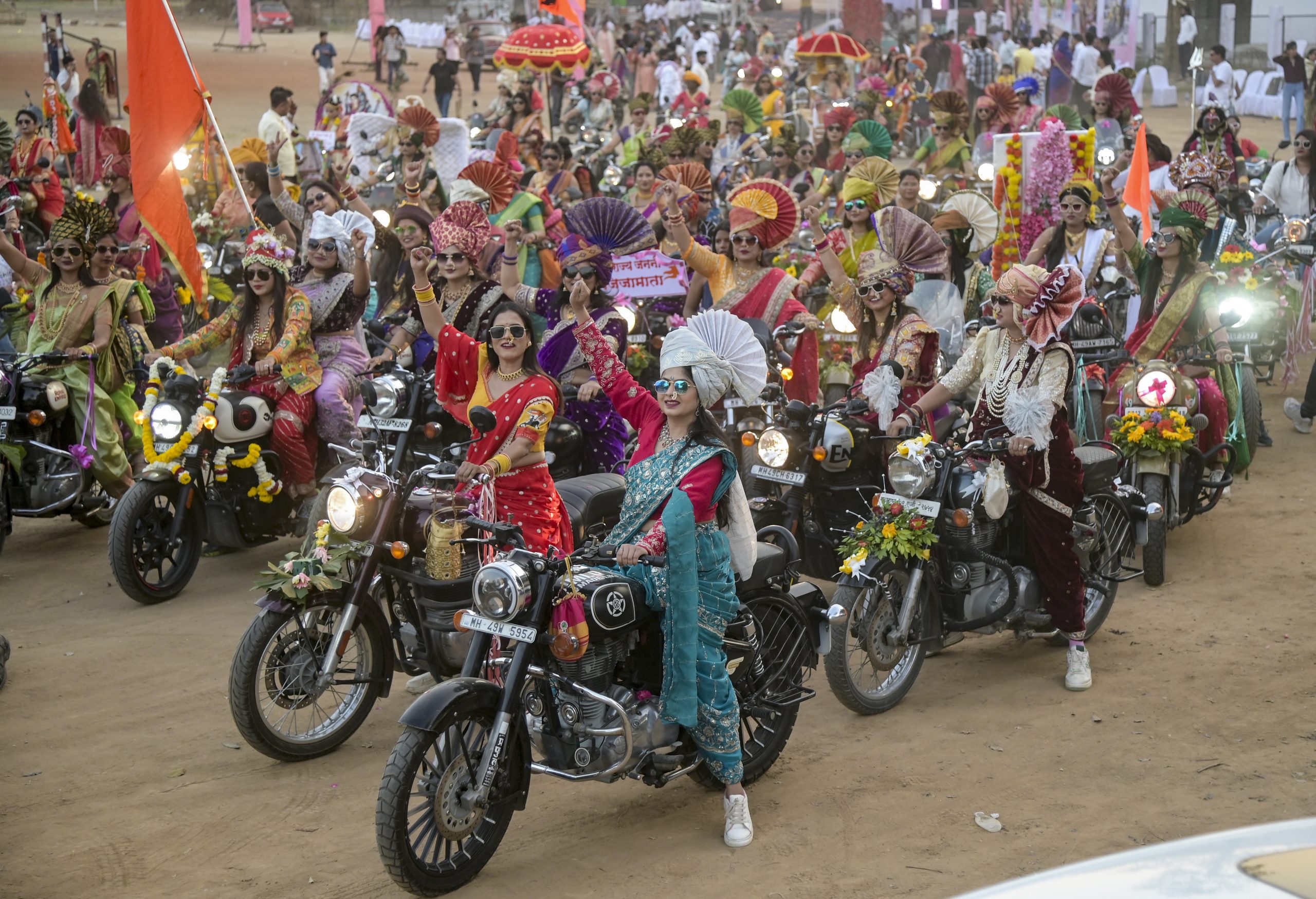 Nagpur: Women dressed in traditional attire take part in a bike rally on International Women's Day, in Nagpur, Sunday, March 8, 2026. (PTI Photo) (PTI03_08_2026_000438B)