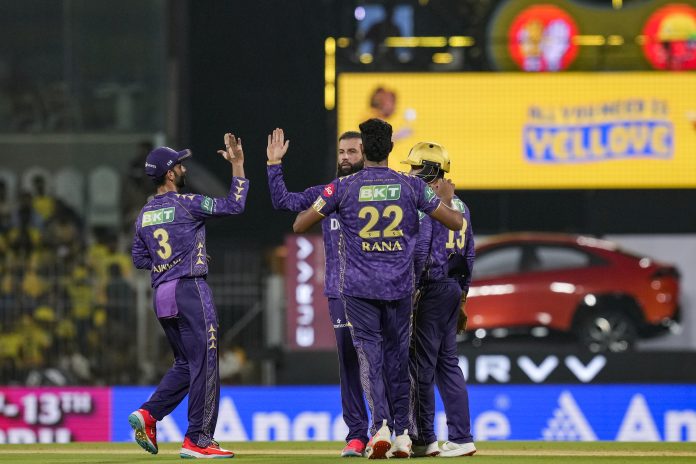Chennai: Kolkata Knight Riders� Moeen Ali celebrates with teammates after taking the wicket of Chennai Super Kings� Devon Conway during an Indian Premier League (IPL) 2025 T20 cricket match between Chennai Super Kings and Kolkata Knight Riders, at the MA Chidambaram Stadium, in Chennai, Friday, April 11, 2025. (PTI Photo/R Senthilkumar) (PTI04_11_2025_000398B) *** Local Caption ***