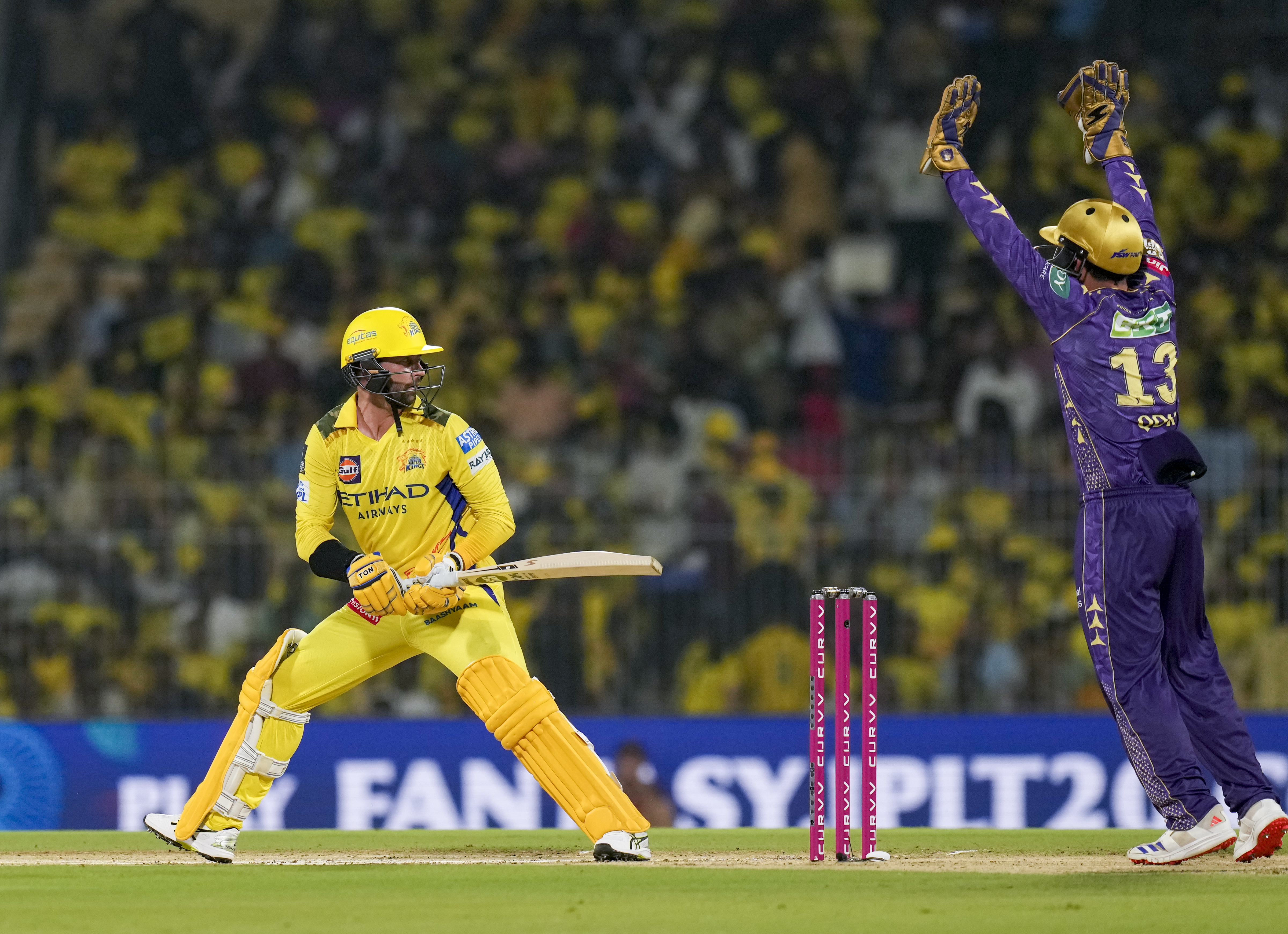 Chennai: Kolkata Knight Riders� Quinton de Kock appeals successfully for the wicket of Chennai Super Kings� Devon Conway during an Indian Premier League (IPL) 2025 T20 cricket match between Chennai Super Kings and Kolkata Knight Riders, at the MA Chidambaram Stadium, in Chennai, Friday, April 11, 2025. (PTI Photo/R Senthilkumar) (PTI04_11_2025_000400B) *** Local Caption ***